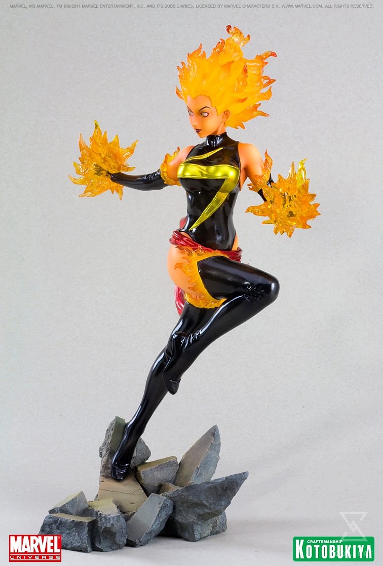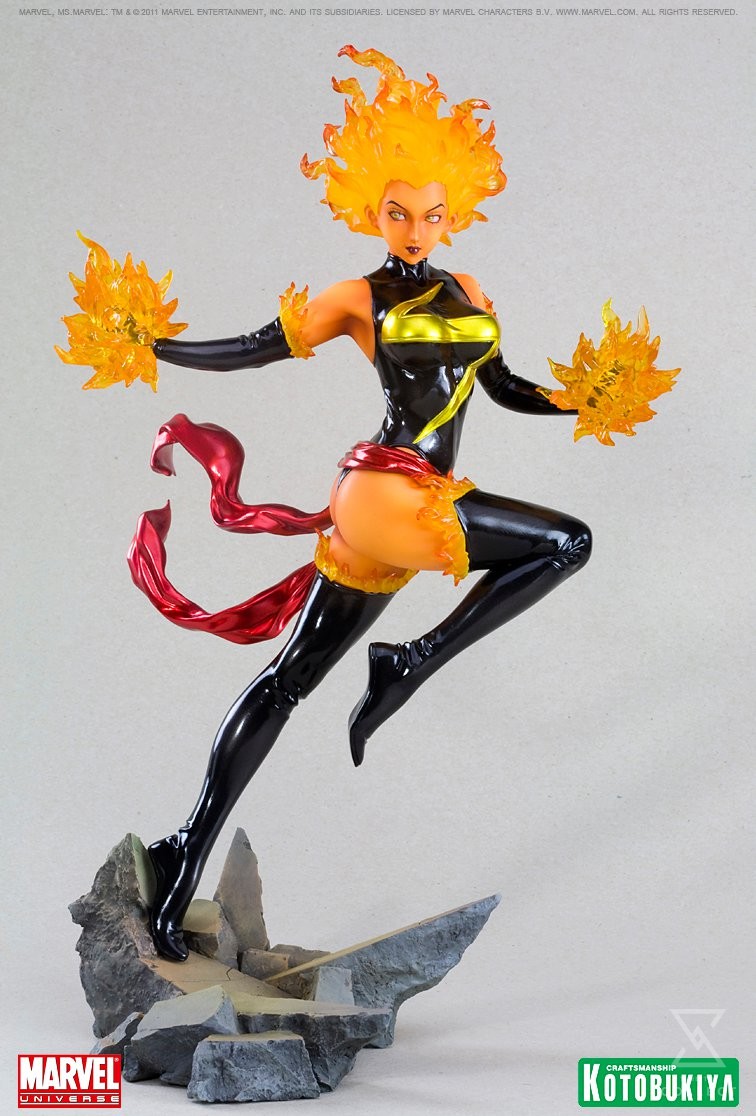 Binary brings back the power, beauty, and grace of Ms. Marvel with a fantastic new look. The magnificent superheroine displays that strength and power as she casually rises into the air, supported by just one shapely leg as she flies off from a rocky landscape. Her dynamic pose captures her with her arms outstretched and one leg bent at the knee, which combined with the other pointing straight down serves to highlight the incredible beauty of her physique. Binary’s sexy costume is recreated with the glossy black and gold bodysuit with matching black boots and gloves, while her metallic red waist cloth whips in the air behind her with a great fabric texture. All of that contrasts nicely with her all-new orange skin tone and translucent flame effects on her legs and arms, not to mention the explosive inferno of her hair! Binary’s newly designed face is otherworldly and beautiful at the same time.
