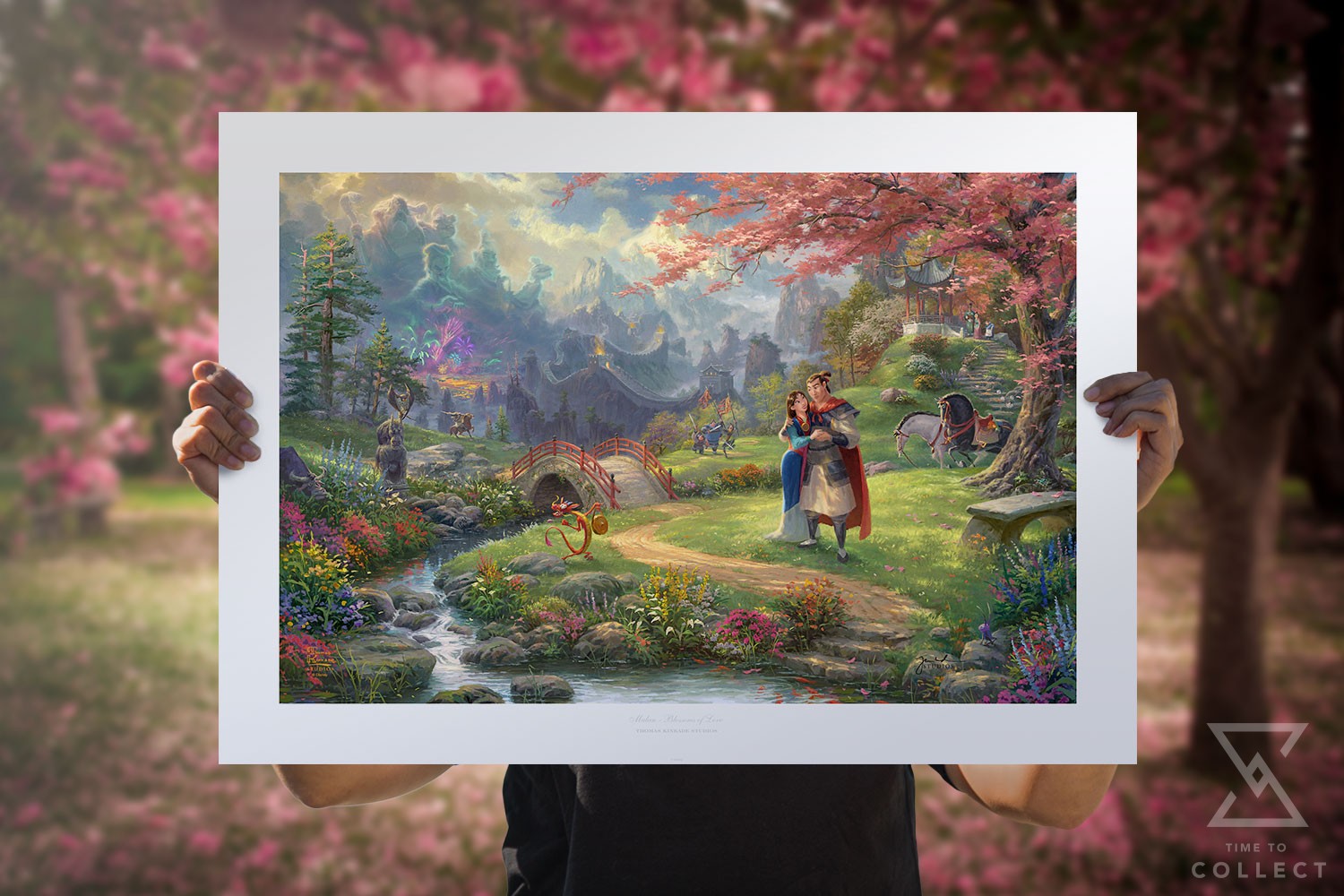 The Mulan Blossoms of Love unframed limited edition paper print presented by Thomas Kinkade Studios features premium heavyweight 100 lbs paper, long-life pigment inks that outperform conventional press inks, and an individually numbered certificate of authenticity matched to the art piece. For fans of Thomas Kinkade Paintings and Disney art!