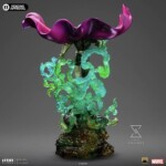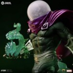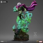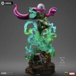 Levitating over technological devices and surrounded by tentacles of an emerald mist that emanates from his left fist and coils around his legs, the villain master of illusionism appears holding in his right hand a sphere made of the same enigmatic fog that surrounds him. With his traditional green costume and purple cape, with his face hidden inside a moon-shaped globe on his head, his plans to defeat his greatest rival, Spider-Man, are as complex and almost indecipherable as the codename he adopted in his criminal career. A true master strategist, using holograms, drones, mirror tricks, and even androids in his plans, he joins other great villains of the Friendly Neighborhood hero in the form of a fantastic statue from Iron Studios that presents “Mysterio – Spider-Man vs Villains Diorama – BDS Art Scale 1/10”, adding to another Iron Studios diorama inspired by Marvel comic books.