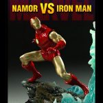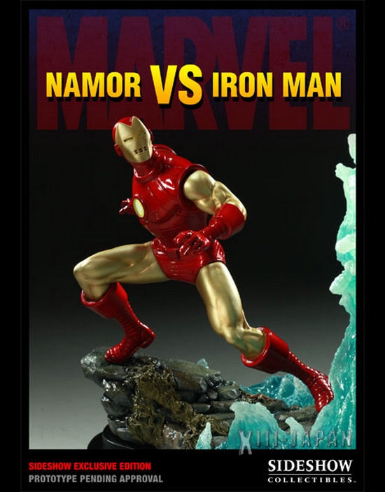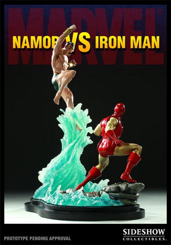 Sideshow proudly presents this fantastic new addition to the Marvel Diorama series, the Namor VS Iron Man Diorama. Pitting the Sub-Mariner against ol’ Shellhead in one of their many ongoing battles, this outstanding diorama is cast in heavy-weight, high-quality polystone. Each piece is individually painted and finished to exacting standards, each with its own unique quality and detail that is the trademark of a handcrafted Sideshow Collectibles product. Iron Man is captured in his classic armor ready to combat the Sub-Mariner, who surging from the water atop a cresting wave of translucent water, and features a switch-out right hand (either fist or hand holding trident). The Namor VS Iron Diorama is the perfect addition to any Marvel collection.