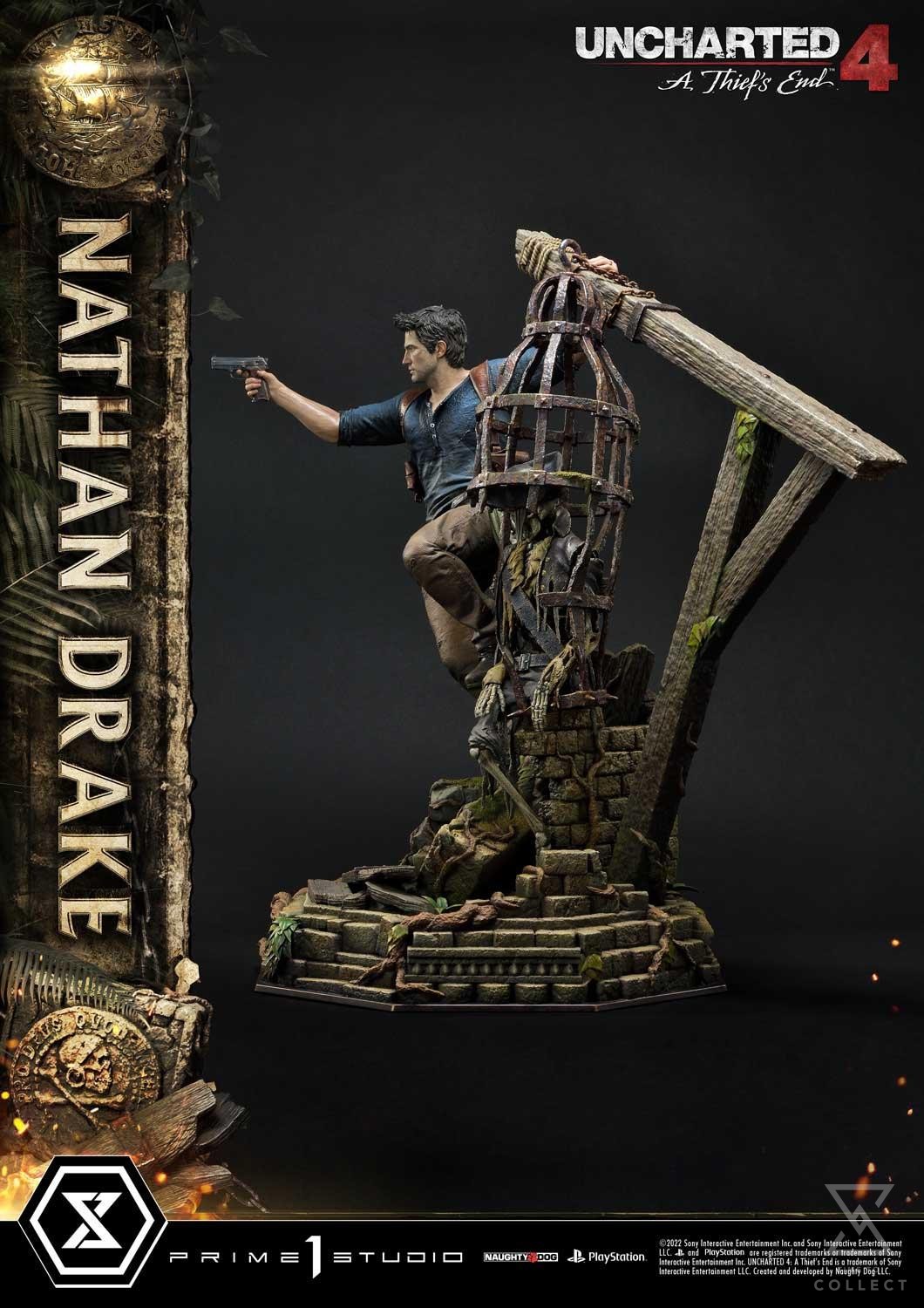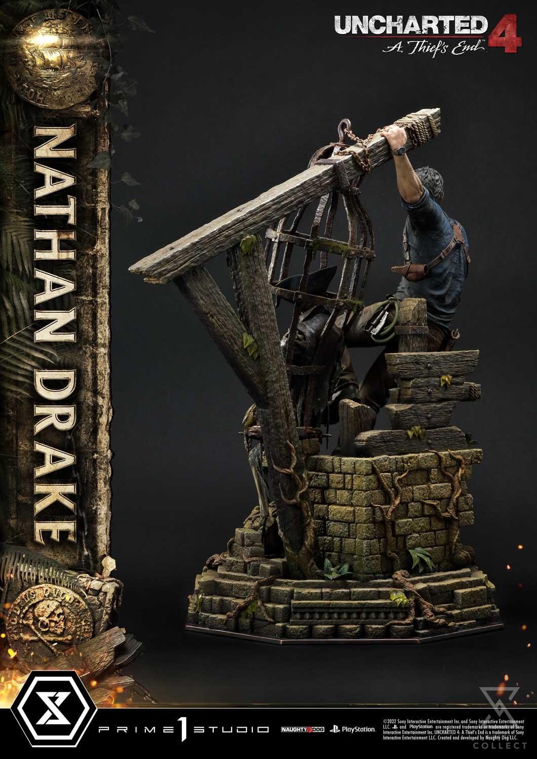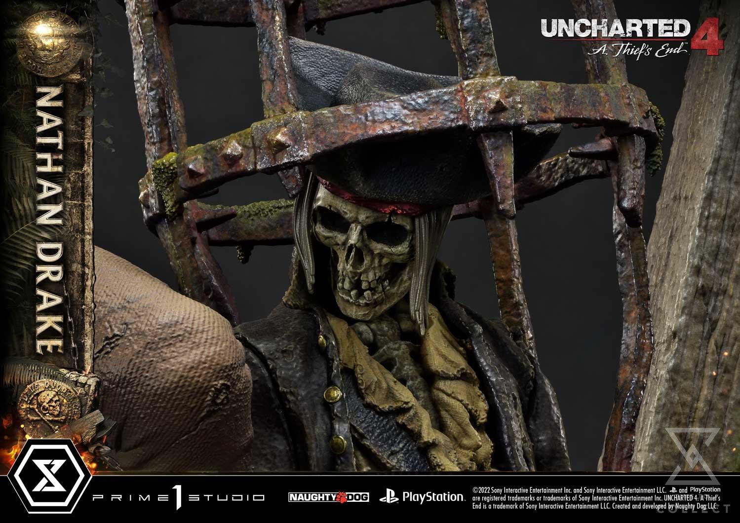 In this thrilling 27-inch tall statue, Prime 1 Studio artists have posed an extremely acrobatic Nathan Drake in the midst of yet another exciting adventure. Nathan hangs off a wooden beam, supporting a cage inhabited by a long-dead crewmate of the famed pirate, Henry Avery! Nathan aims his trusty sidearm at an unknown combatant, who is bound to lose his life in this encounter! Our skillful artisans have included a variety of textures and materials in this statue, which underscores the importance the source material played in its creation of it. The world of Uncharted is nothing if not dense with detail, grit, and atmosphere. The Studio took full advantage of this when creating this magnificent figure! The weathering, the dirt, the grime, all come alive with the lifelike rendering of the painting masters. Nathan Drake’s base is a Libertalia-themed environment, complete with an overgrown jungle, ancient masonry, and incarcerated pirate corpses! Uncharted 4 fans! Take advantage of this phenomenal UPMU4-01 Nathan Drake Regular Version statue before it gets lost in time.