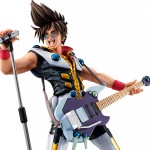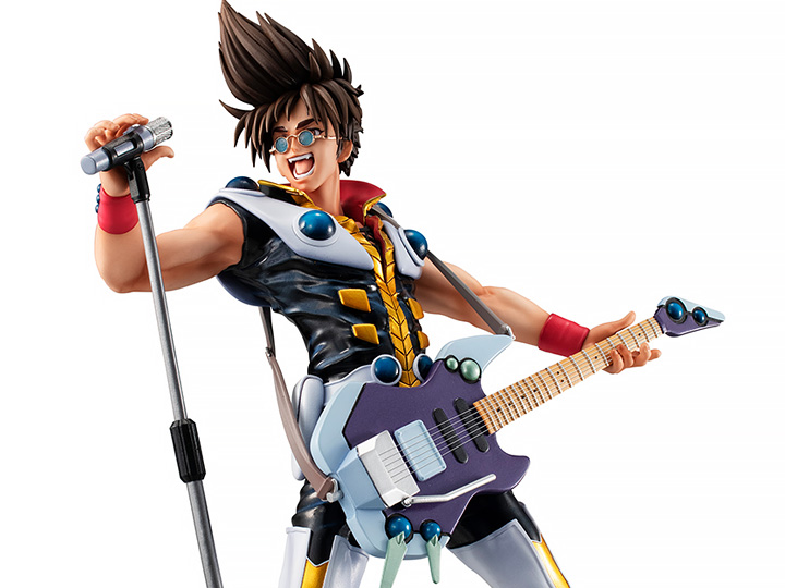 This Macross 7 Fire Bomber figure of Nekki Basara is seen in an epic pose, with guitar and mic in hand. This figure stands at nearly 9 inches tall, intricately detailed, and ready for any anime collection!