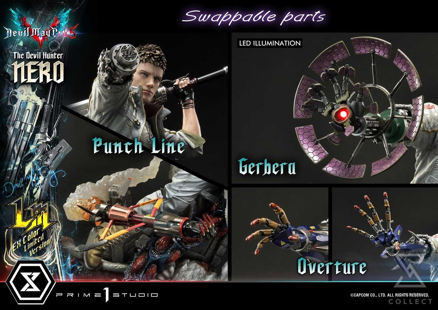 Prime 1 Studio is proud to present and incredible addition to our Ultimate Premium Masterline series: the 1:4 scale UPMDMCV-01LM Nero EX Color Version from Devil May Cry V! Outfitted in a stunning white and gold ensemble, sandy-haired Nero is at it again with his multiple Devil Breakers! Set on a stunning Qlipoth Base, this dynamic 28-inch-tall Nero dazzles in action mode as he brandishes all the tools of his craft. Clothed in his alternate, all-white, unlockable outift, this Nero looks both stylish and deadly. This EX Color Limited Version packs a punch with four (4) swappable right arms, two (2) swappable left forearm, and a freestanding Green Orb, all included in this magnificent set!