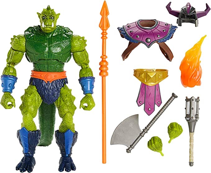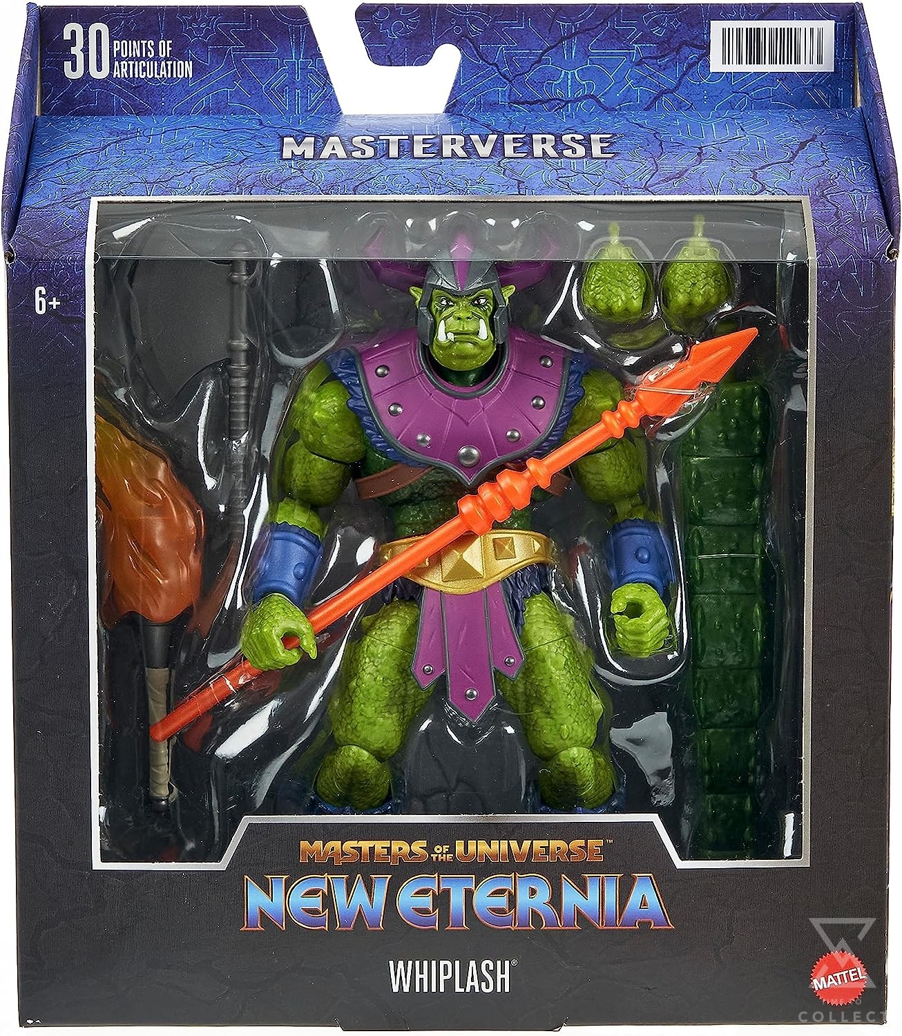This Masters of the Universe Masterverse Whiplash is an oversized action figure at 8.5 inches tall, accentuating his monstrous build and iconic tail. With 30 points of articulation, this first-time Masterverse New Eternia figure comes with authentic design details collectors will love. The removable helmet and armor pieces on this fan-favorite villain are a nod to the original concept art, and multiple accessories are included for storytelling and display. This character with his thrashing tail of destruction makes a great gift for MOTU fans.