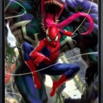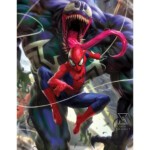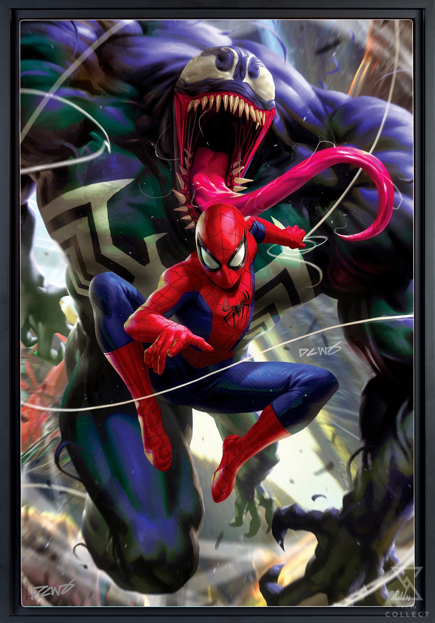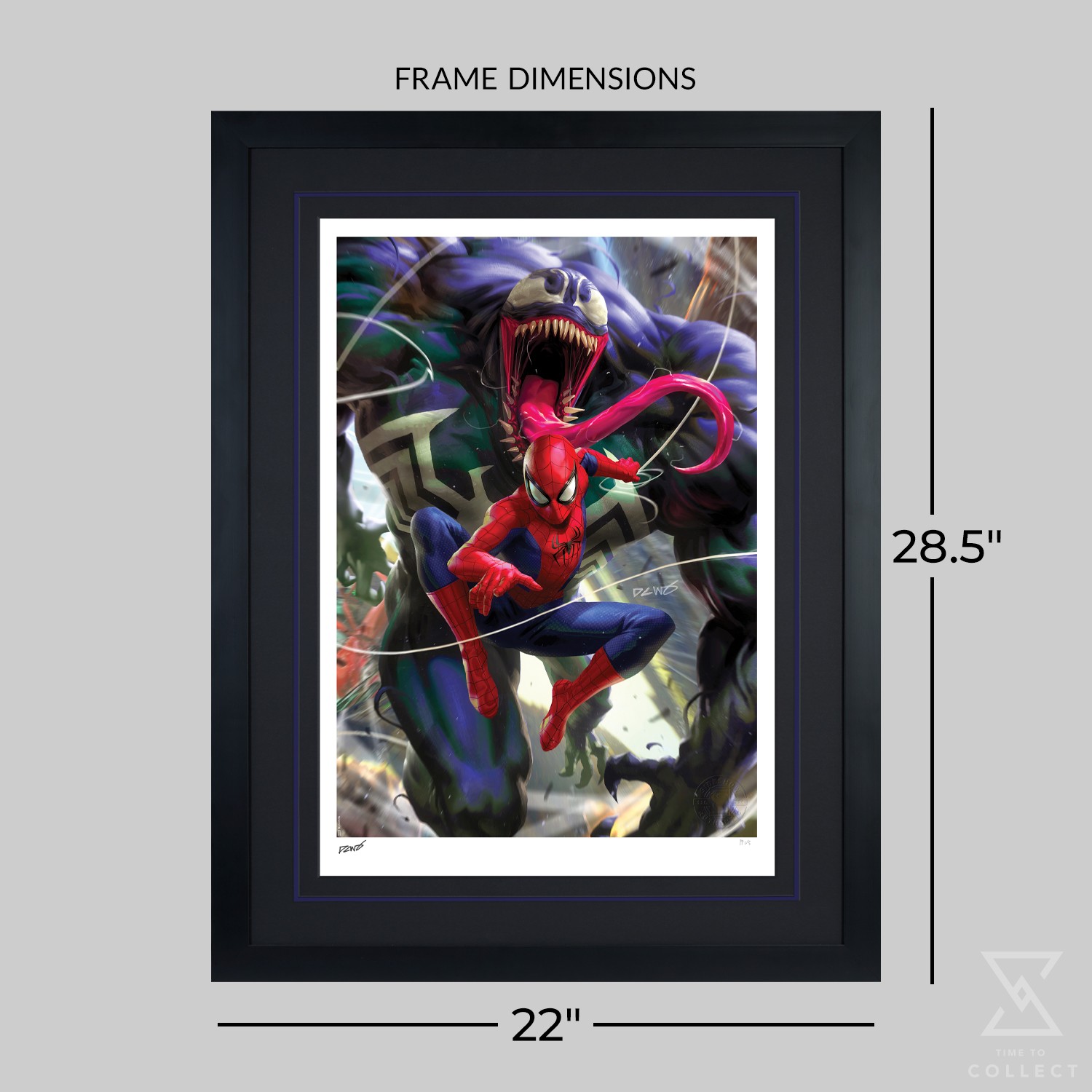 A symbiote is loose in the streets, and only Spidey can stop him! In this action-packed illustration, a colorfully costumed Spider-Man flees the massive maw of his longtime enemy Venom. Destruction lies in the pair’s wake, and only a few thin white webs separate this super hero from success or certain doom. Can Peter Parker swing to safety before Venom chomps down?
