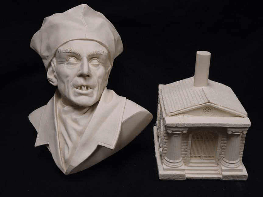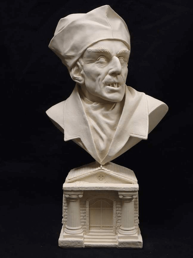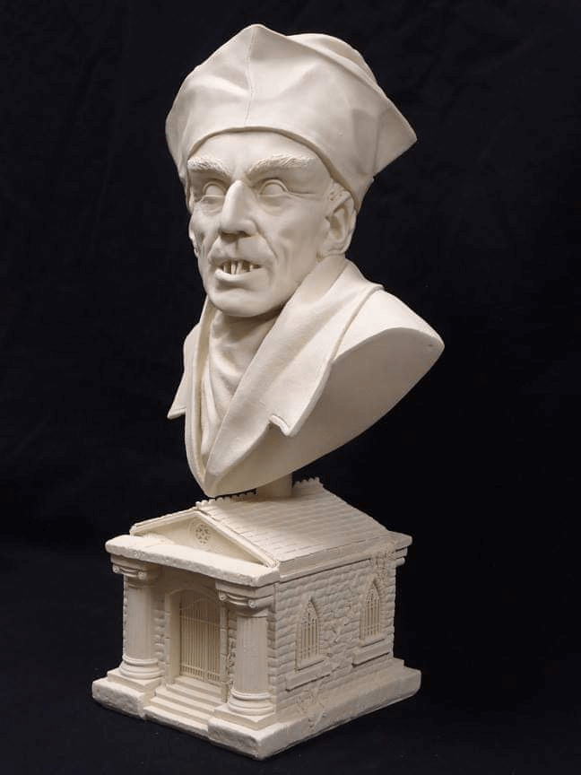 Sculpted by Jeff Yagher, this 1/2 scale bust of the notorious Count Orlok or Nosferatu as many have come to know him, stands approximately 15 in tall. LED lighting kit and clear cast stained glass windows for the crypt included.