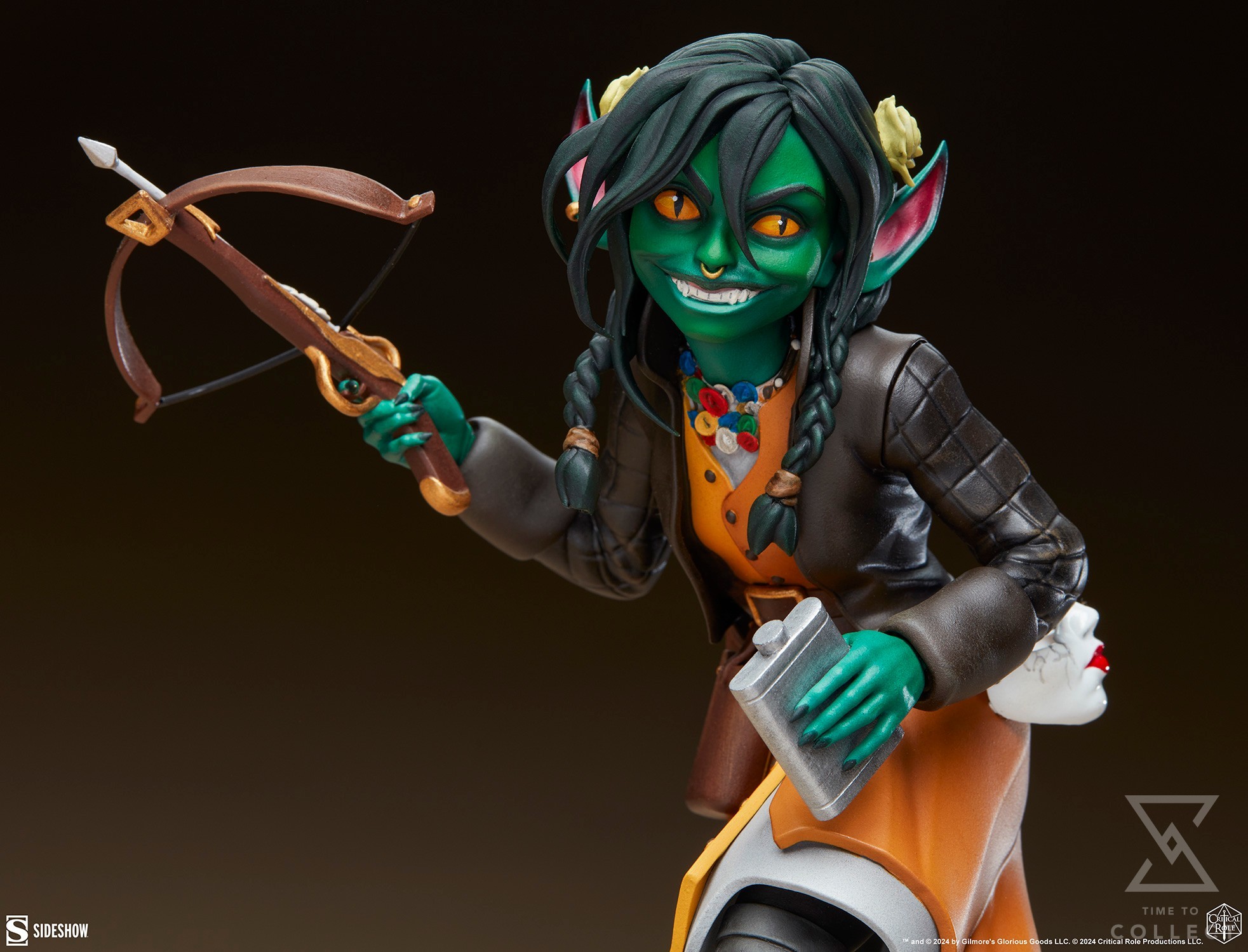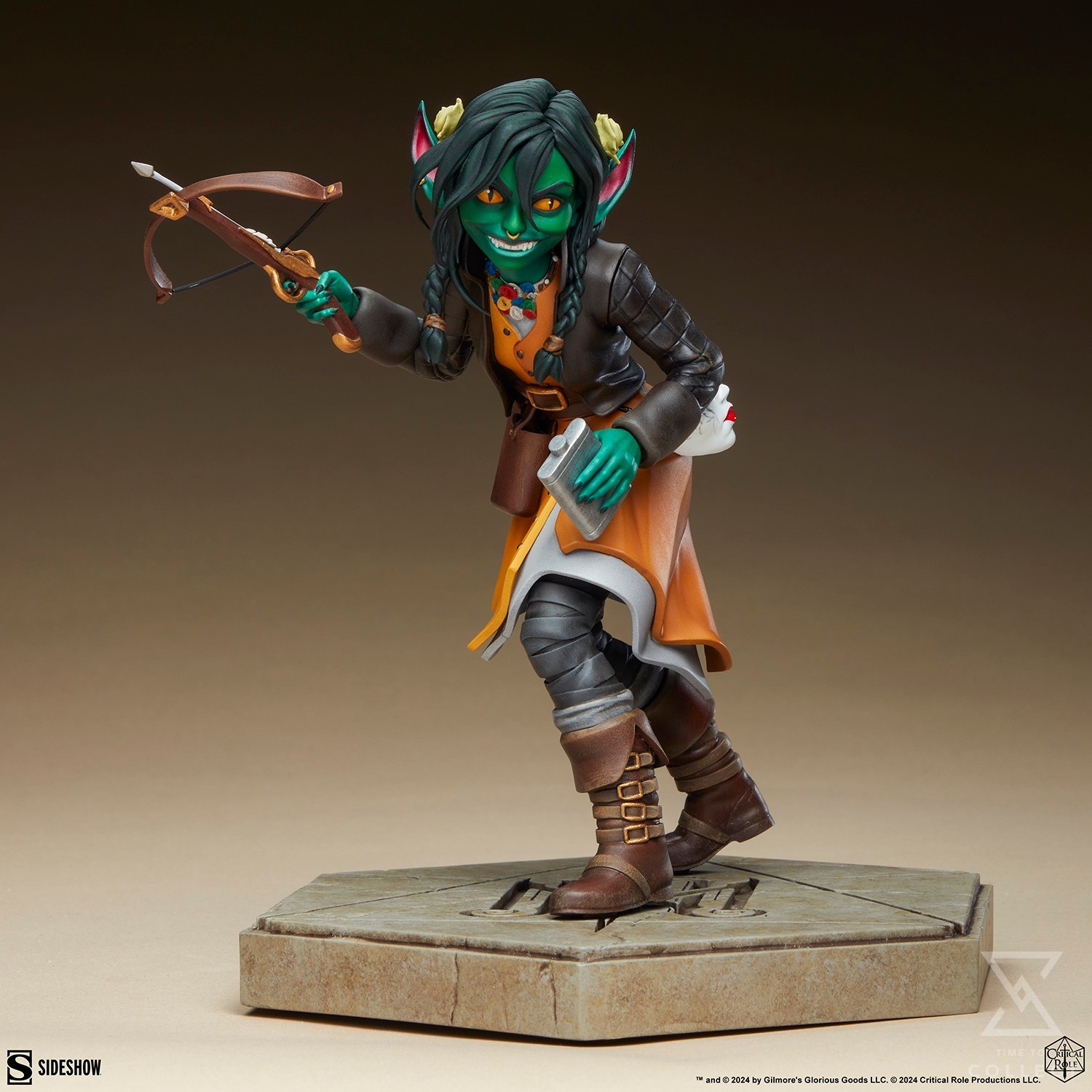 Cute as a button and just as likely to steal one from under your nose, Nott the Brave uses her diminutive goblin size and skittish nature to strike from the shadows. Over her time with the Mighty Nein, she grows more confident as an arcane and alchemically inclined troublemaker and protector of her found family. The Nott the Brave Statue captures her mid-campaign appearance with a vibrant yellow and gray layered dress, a brown jacket, wrap leggings, and brown boots. Her dark hair is sectioned in two braids, and her green complexion is contrasted with yellow cat-like eyes. Nott holds her loaded crossbow aloft with one hand while the other grips her silver flask filled with a little liquid courage. On her hips she wears a quiver of bolts and the porcelain mask she used to hide behind.