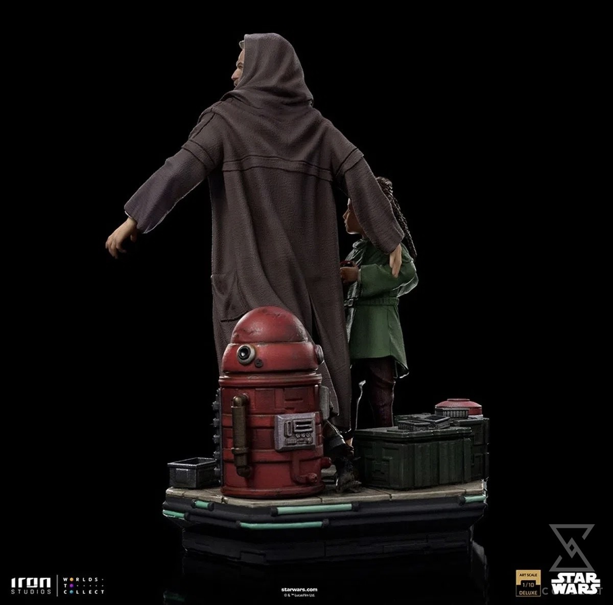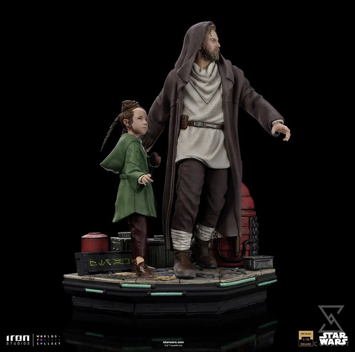 Through the chaotic streets of planet Daiyu, under the lights of tall buildings, luminous signs, and the eyes of mercenaries and relentless agents of the Galactic Empire, the former brave Jedi Master risks himself leaving his anonymity to fulfill at any cost his mission of rescuing the young princess from planet Alderaan and get her back in safety to her foster father. After saving and earning the intrepid and fearless girl’s trust, with her by his side wearing a green cloak bringing her small droid called Lola in one of her hands, and he alert, using a hooded cape to hide his identity, they both search for an escape route to fulfill their mission. Directly from the Star Wars spin-off series released on streaming service Disney+ in 2022, Iron Studios present their diorama statue “Obi-Wan and Young Leia Deluxe- Obi-Wan Kenobi – Art Scale 1/10”, with the Jedi hero, master of Anakin Skywalker, next to his protectee, daughter of his former apprentice.