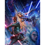 Based on the epic standoff seen in Star Wars: The Clone Wars™, this colorful composition revisits the fated duel between ex-Padawan™ Ahsoka Tano and the former Sith™ Darth Maul. The foes ignite their unique lightsabers and charge into battle, clashing in the throne room of Mandalore™ during a devastating siege. Meanwhile, echoes of their former selves can be seen in the illustration, showing just how greatly these learners have grown since they first began finding their way in the Force.