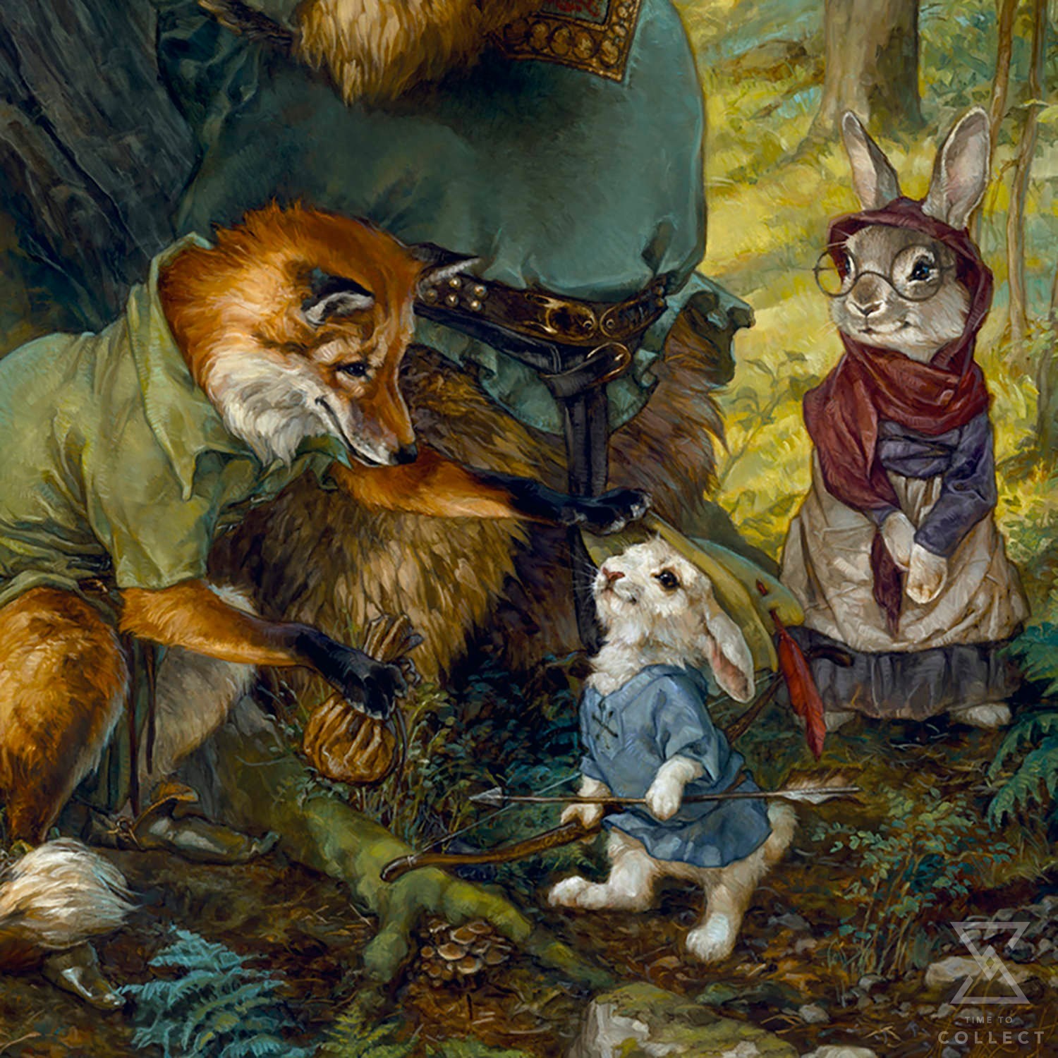 In a stunning visual love letter to the celebrated 1973 animated classic Robin Hood, artist Heather Edwards has created a tapestry of color, characters, and storytelling. In a fusion of memorable moments from the film, Heather portrays the hero and villain together in the composition, each shown in a moment that reflects their true nature. The hero of Nottingham himself, Robin Hood, generously gifting his hat and bow to young Skippy, and Prince John, the selfish, spoiled, and cruel usurper king, sucking his thumb and throwing a childish tantrum after being outsmarted by his adversaries, Robin Hood and Little John.