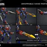 Optimus Prime is crafted with impressive attention to details and features LED light-up on various parts of the statue. The head is swappable to choose between wearing a battle mask or unmasked. The right arms can be interchangeable to give the option to choose between a pointing pose or a pose holding a variety of swappable weapons.