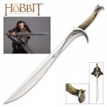 In Third Age of Middle-earth, Thorin Oakenshield and his Company of Dwarves came upon a troll lair in Rhûdaur. Thorin found an ancient Elven sword named Orcrist, forged by the high Elves of the West. Adorning the pommel is an emblem of the heraldry of Ecthelion of the Fountain. The hilt is shaped from the tooth of a dragon. This authentically detailed replica is a reproduction of the filming prop built by Weta Workshop of New Zealand and used in the movie, THE HOBBIT: AN UNEXPECTED JOURNEY. United Cutlery, industry leader in fine movie reproductions, has meticulously recreated the prop using only the finest grade materials and craftsmanship. Close attention to detail was a top priority. The sword is 38 3/4” long and features a 25 7/8″ stainless steel blade with an etched runic inscription. The hilt is crafted with solid metal parts, simulated gemstones and an acrylic resin grip. It is presented with a wood wall display and includes a certificate of authenticity.