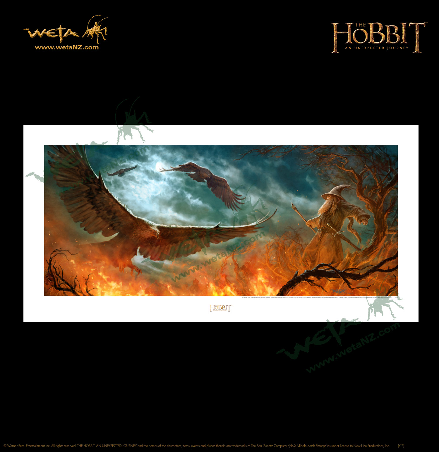 Thinking quickly, Gandalf ignites pines cones which the Dwarves send hurtling down upon their foes like fiery missiles. But this desperate act is a mere tactic of delay, for without help, whether by tooth, fall or flame, they know death awaits them all in the leering pale Orc’s grin. He has them! Yet even in the face of this certain doom, hope swoops unlooked-for from above in the form of the Great Eagles and their lord, who, with wings beating flames in the faces of their enemies and talons flashing, send Orc and Warg alike plunging into the abyss and sweep Bilbo and his companions to safety. The scene from The Hobbit: An Unexpected Journey has been captured by Weta Workshop concept designer Nick Keller who has been with Weta for seven years and was part of the core team of Weta designers who worked on the movie.