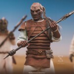 Pagetti Rook is a Weequay alien, a species distinct for their tough, wrinkled skin. Part of Jabba the Hutt’s barge crew, Pagetti Rook is known to fans as the guard who forces Luke Skywalker toward the Sarlaac at the Great Pit of Carkoon with an impressive vibrospear. Before his defeat, the Weequay showcases a ruthless and intimidating exterior to the prisoners.