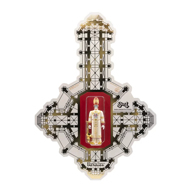 The First Papa of the Dark Ministry makes his action figure debut as a 3.75″ ReAction Figure! Relive all the excitement from Ghost’s A Pale Tour Named Death as Papa Emeritus Nihil arrives with his signature sunglasses and saxophone, and packaged on a gold-foil stamped Grucifix cardback.
