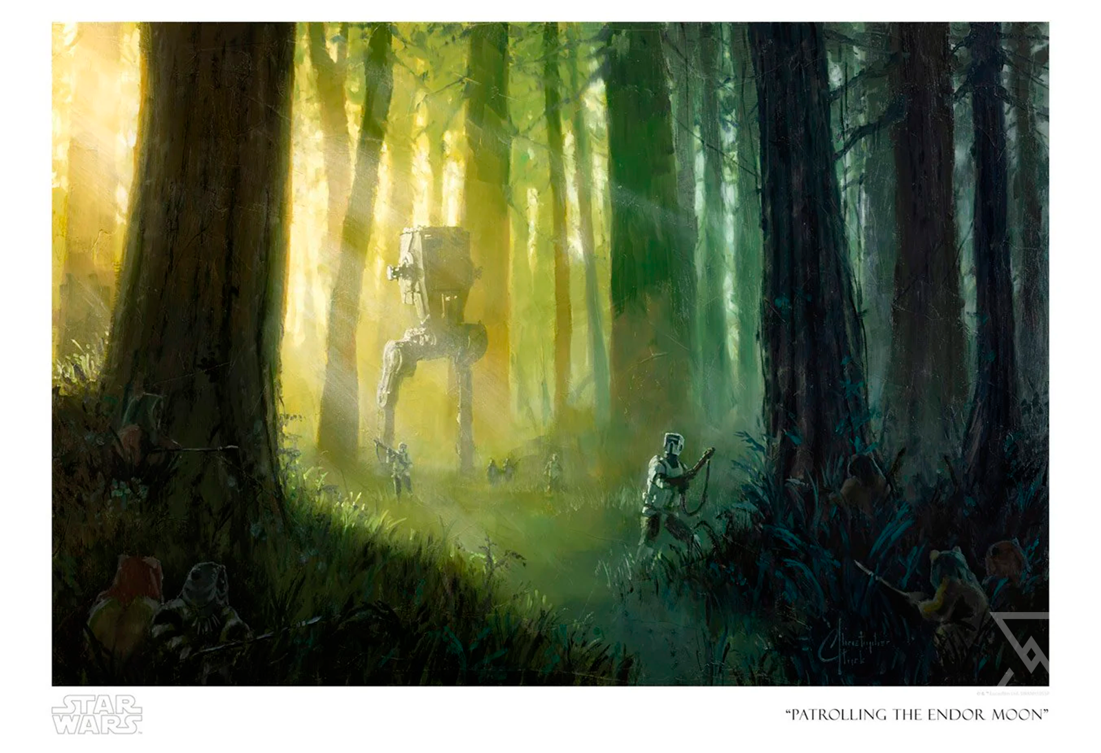Ewoks stand guard waiting to sneak attack an approaching AT-ST and Scout Troopers in this incredible Star Wars artwork inspired by Star Wars: Return of the Jedi. Each fine art giclee print is hand-numbered from a limited edition of 150 pieces and comes with a Certificate of Authenticity.