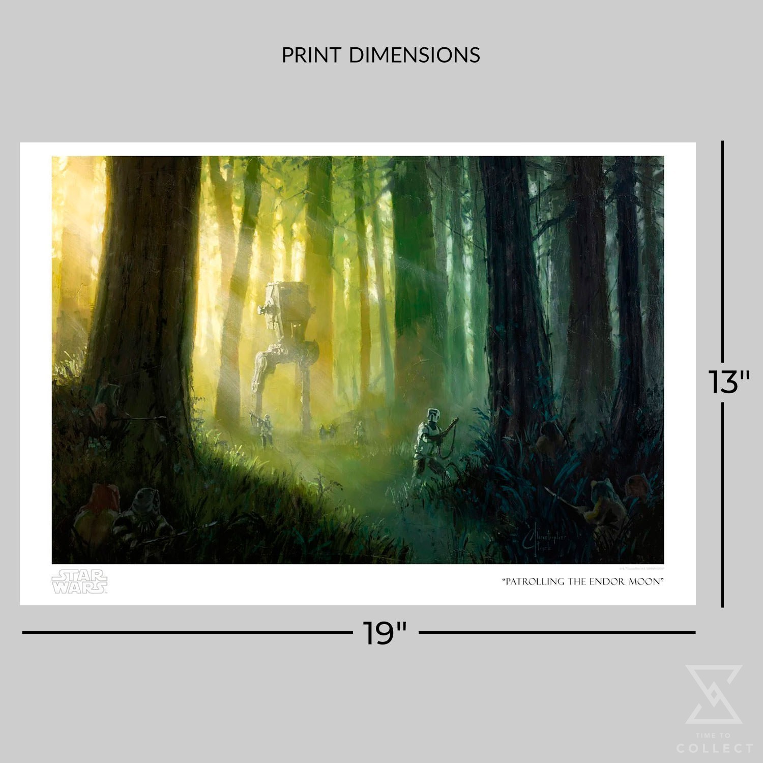 Ewoks stand guard waiting to sneak attack an approaching AT-ST and Scout Troopers in this incredible Star Wars artwork inspired by Star Wars: Return of the Jedi. Each fine art giclee print is hand-numbered from a limited edition of 150 pieces and comes with a Certificate of Authenticity.