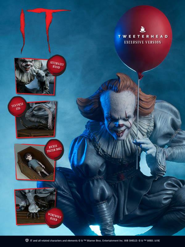 The exclusive version includes a Richie Tozier doll in coffin, swap out right hands, including one with a red balloon, removable tentacle legs that attach to the base, and a certificate signed by all those who worked on the statue.