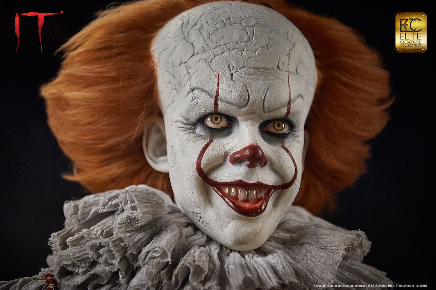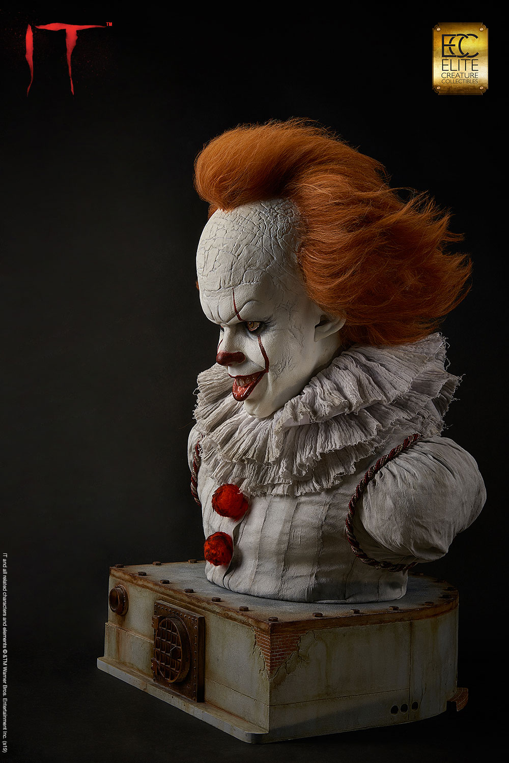 Elite Creature Collectibles is proud to introduce our museum-quality Pennywise bust from the movie IT based on the 1986 novel of the same name by Stephen King. This iconic villain is perfectly sculpted by legendary Hollywood makeup effects sculptor Mitch Devane, whose credits include The Nutty Professor, Nightmare on Elm Street 3: Dream Warrior, Tim Burton’s Planet of the Apes, Mighty Joe Young and Bram Stoker’s Dracula.