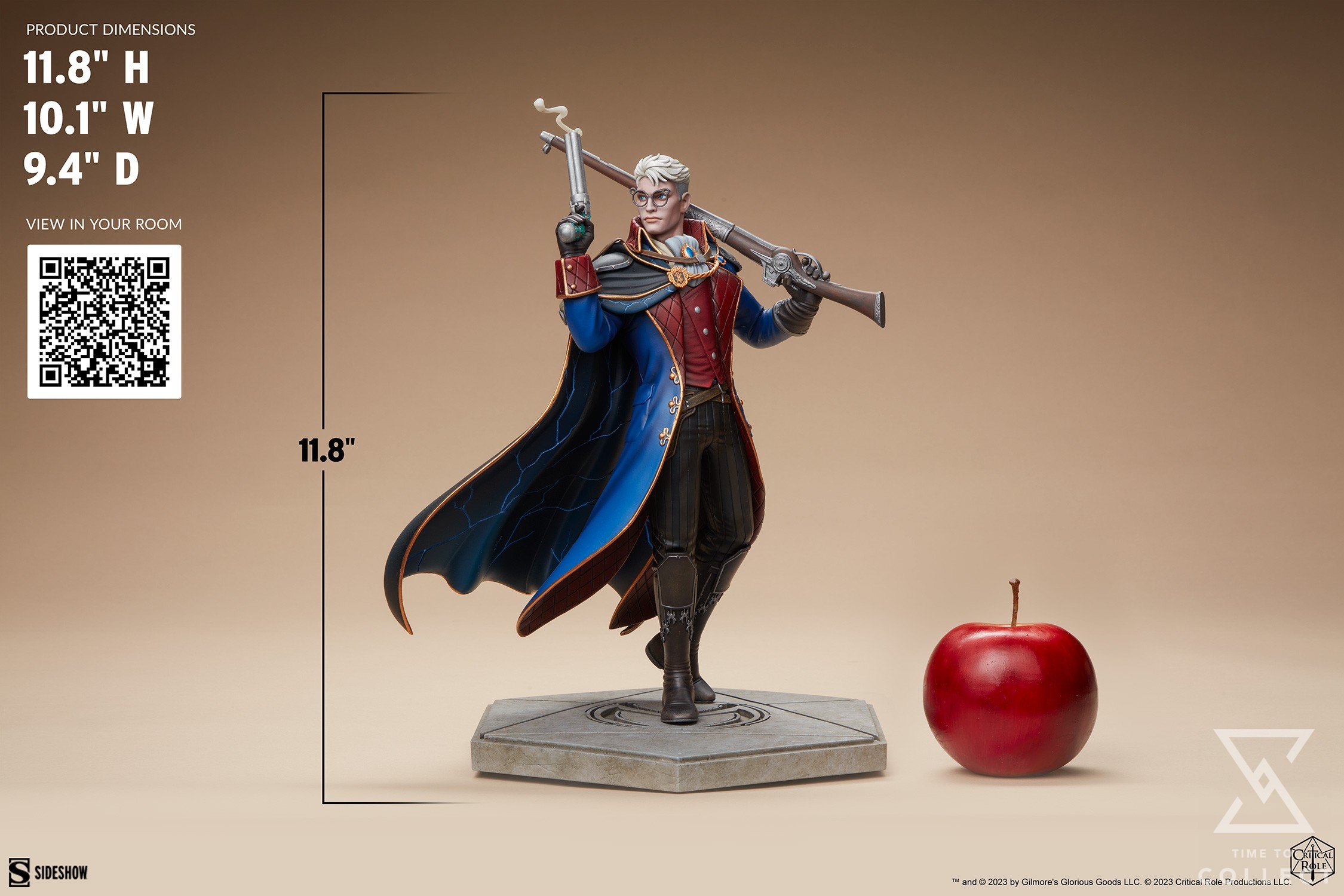 Percival Fredrickstein von Musel Klossowski de Rolo III (but you can call him Percy) is the father of firearms in Exandria. From dark dreams, he constructed his first weapon, exacting his revenge for the slaughter of his noble family. Depicted here as a high-level hero, this Percy Statue embodies his keen eye for engineering and extensive travels with Vox Machina. He is cloaked in Cabal’s Ruin, a Vestige of Divergence, that crackles with absorbed magical energy. Percival carries the wheellock rifle, Bad News, in his left hand, which is gloved with the electric gauntlet he calls Diplomacy. In his right hand is Animus, the pepperbox pistol taken from the cruel Dr. Anna Ripley. Its smoking barrel serves as a reminder of his ruthless aim against evil, earning him the nickname “No Mercy Percy.”