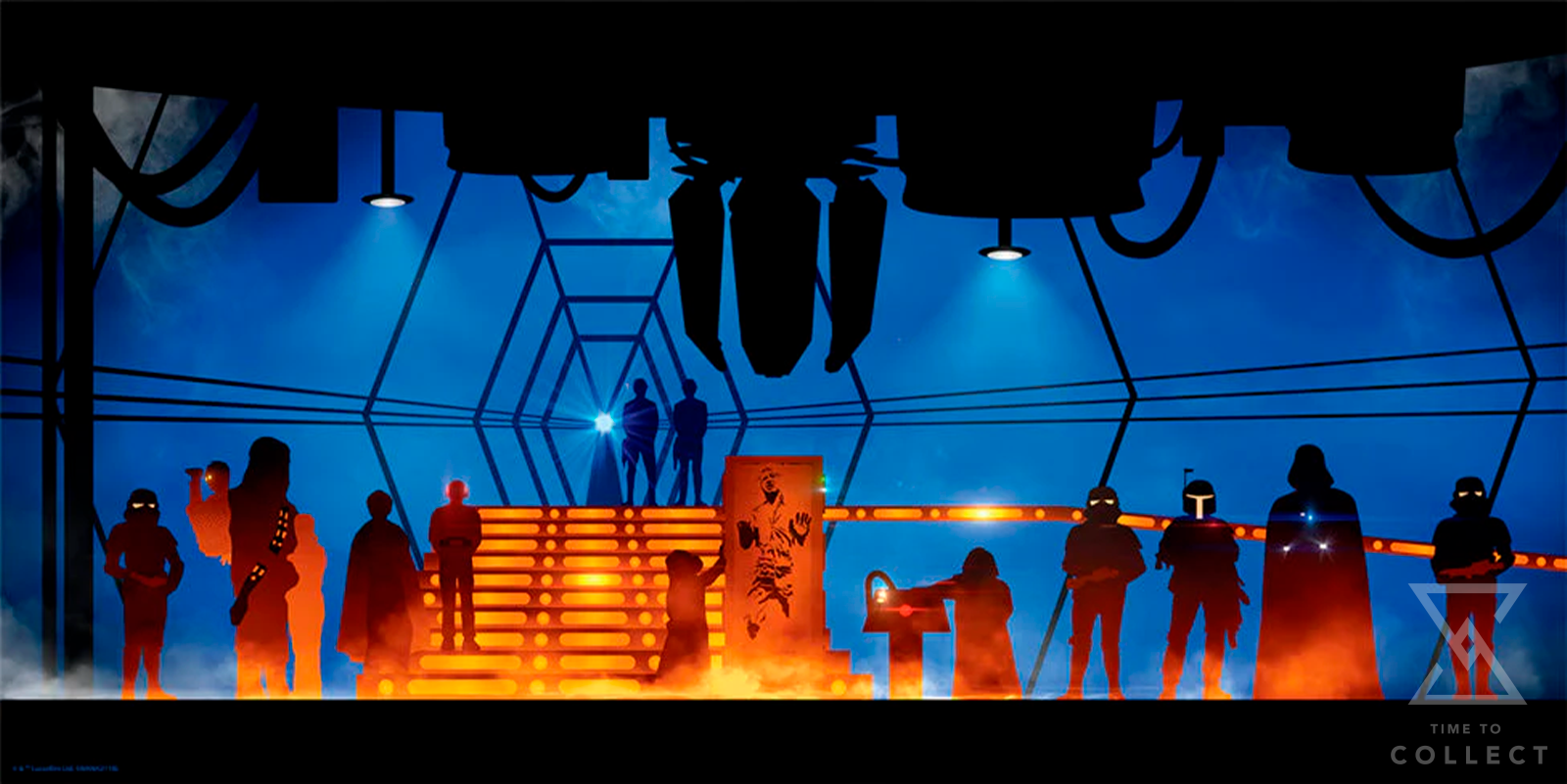 A frozen Han Solo in carbonite is displayed in front of Darth Vader, Boba Fett, Chewbacca, C-3PO, Princess Leia, and Lando Calrissian in this luminous Star Wars artwork inspired by Star Wars: The Empire Strikes Back. Each fine art lithograph print is hand-numbered from a limited edition of 295 pieces and comes with a Certificate of Authenticity.