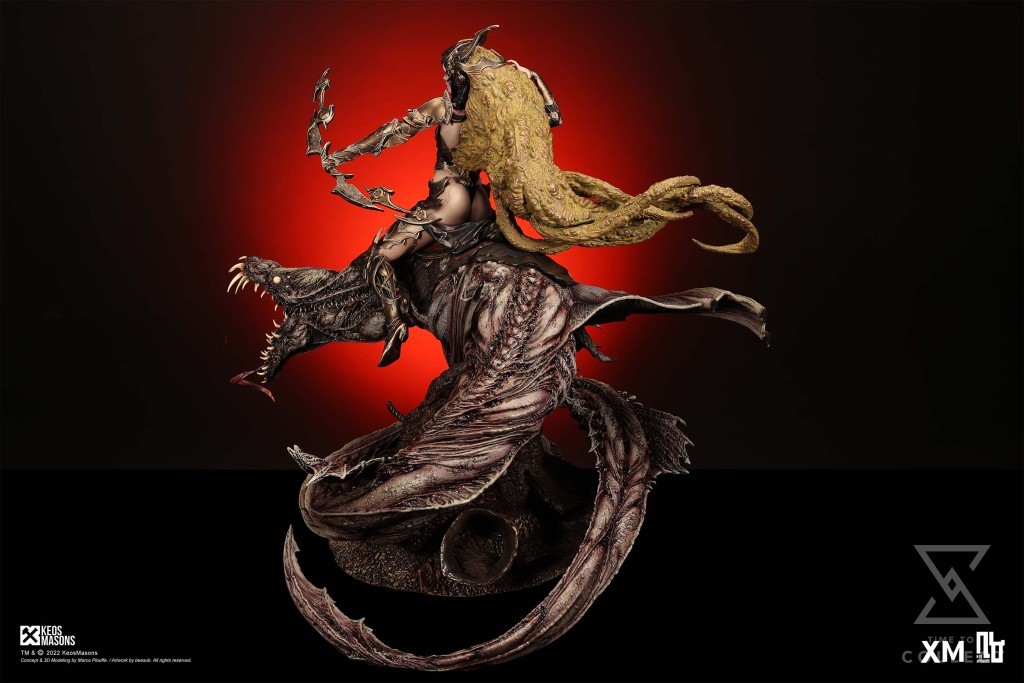 Presenting Pestilence, XM’s second ¼ scale statue from the Four Horsemen line, a unique collaboration with renowned 3D concept design and character modelling company, Keos Masons. Based on characters set in the Neo-Apocalypse world, each statue is presented in a bold, dynamic, and story-laden style. The Four Horsemen serve as effigies of destruction and vengeance— the symbols of an uprising that continue to scour the earth. As a “pleasure series” android, her kind was once subject to some of the worst forms of abuse by humankind. Driven by an infectious taste for revenge and desiring nothing more than to terrorize the human forces with virulent biochemical attacks that spread disease, she is adept at swooping in from above while mounted on a flying serpent to arrive at strategic vantage points, inflicting death from afar with her trusty bow and making whole areas uninhabitable to human beings. Now leading the android forces as one of The Four Horsemen, Pestilence inspires untold dread on her victims, making the general population live in a constant state of sickness. Collectors can choose between 2 head switch-outs. The first one features Pestilence half-masked with a sinister grin. With this switch-out, you can feel her emanating a powerful aura that shows her true desire to spread diseases to exact revenge on her enemies. The second one features Pestilence with a cold-hearted and uncaring unmasked face. Each statue is individually hand-painted and comes complete with XM’s famous quality finish.