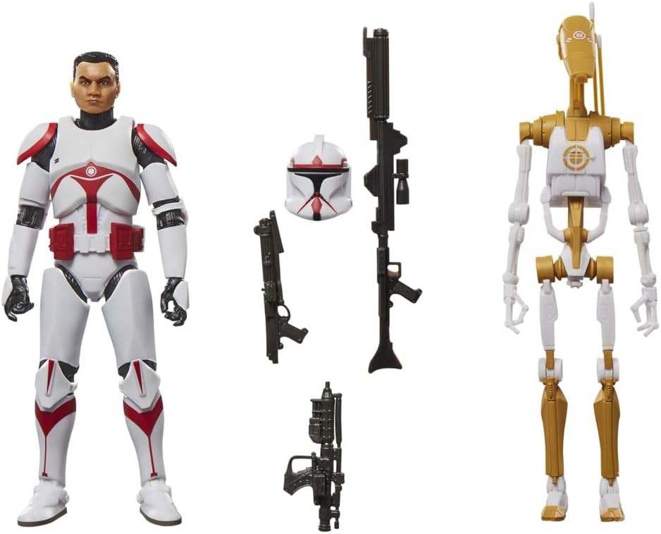 Star Wars The Black Series includes 6 inch action figures, vehicles, and roleplay items from the 40-plus-year legacy of the Star Wars galaxy, letting fans create galactic scenes with a faithfulness to Star Wars comic books, movies, series, and more. This Star Wars Hasbro action figure set is detailed to look like a Phase I Assault Trooper (Coruscant Guard) and a Battle Droid Officer (Training) from Star Wars: Battlefront II. (Additional products each sold separately. Subject to availability.) Star Wars products are produced by Hasbro under license from Lucasfilm Ltd. HASBRO and all related trademarks and logos are trademarks of Hasbro, Inc.