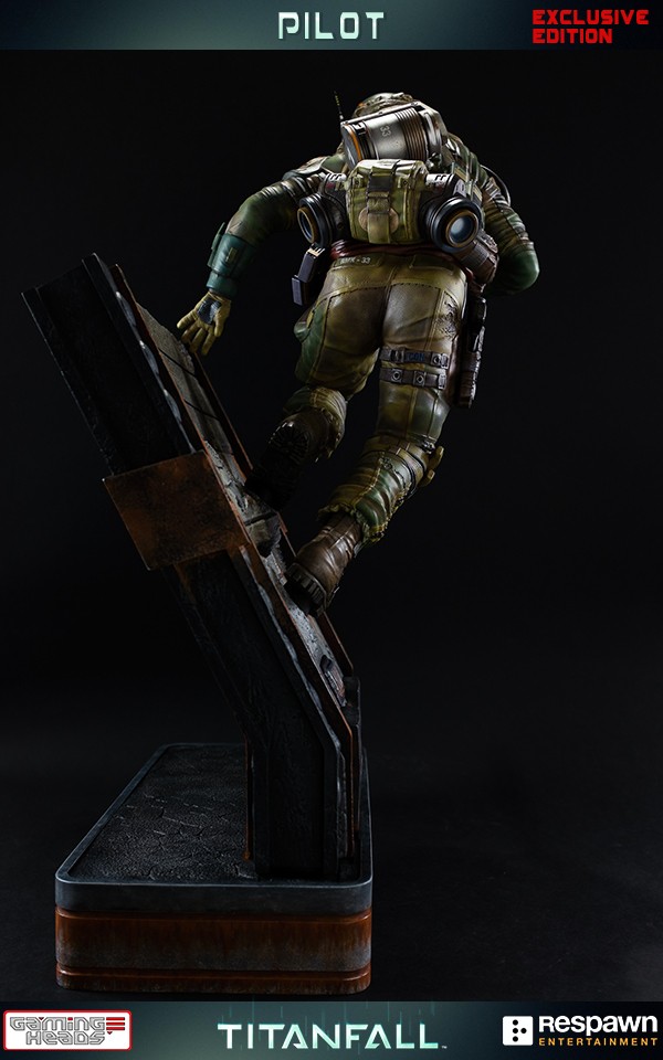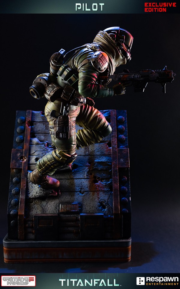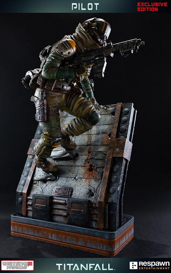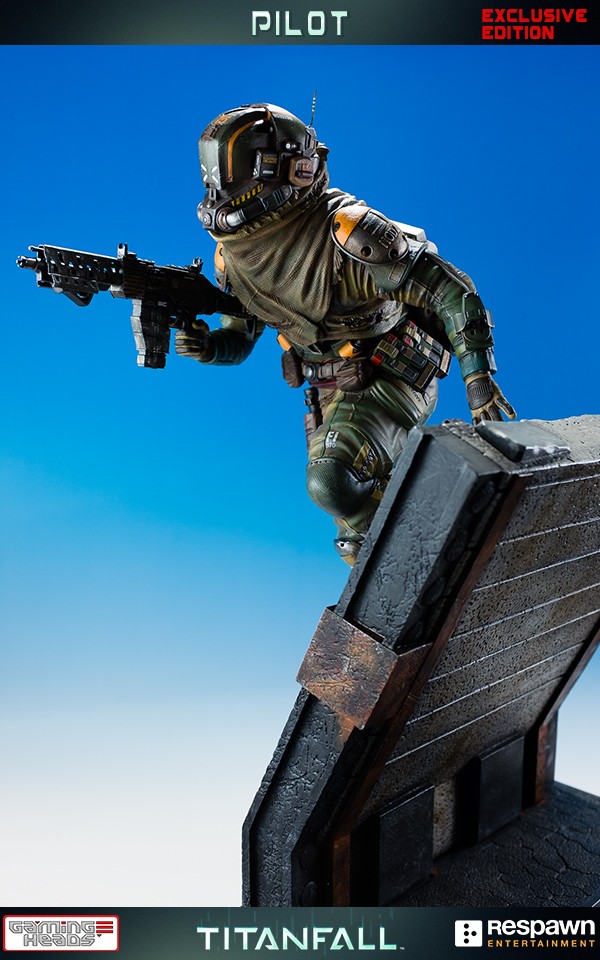 Gaming Heads is proud to unveil the Militia Assault Pilot, straight from Respawn Entertainment’s Titanfall. In this statue, we have portrayed a completely geared up Militia Pilot from the game wall running, wielding a Hemlok Burst-Fire Rifle. Base and figure combined, the Pilot statue measures 23 inches tall.