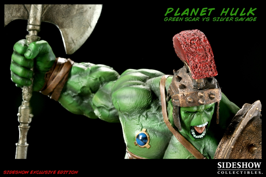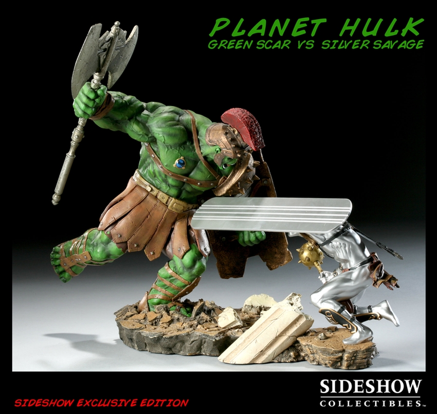 The latest to join Sideshow’s line of Marvel collectibles is the Planet Hulk: Green Scar VS Silver Savage Diorama. This dynamic scene is inspired by the cover of Incredible Hulk #95, drawn by Ladronn, with the two gladiators captured in the heat of battle. The Planet Hulk: Green Scar VS Silver Savage Diorama is cast in heavy-weight, high-quality polystone, then hand-finished and hand-painted to exacting standards. Each piece is individually hand-numbered, then packaged in a durable foam shipping interior and beautiful full color box.