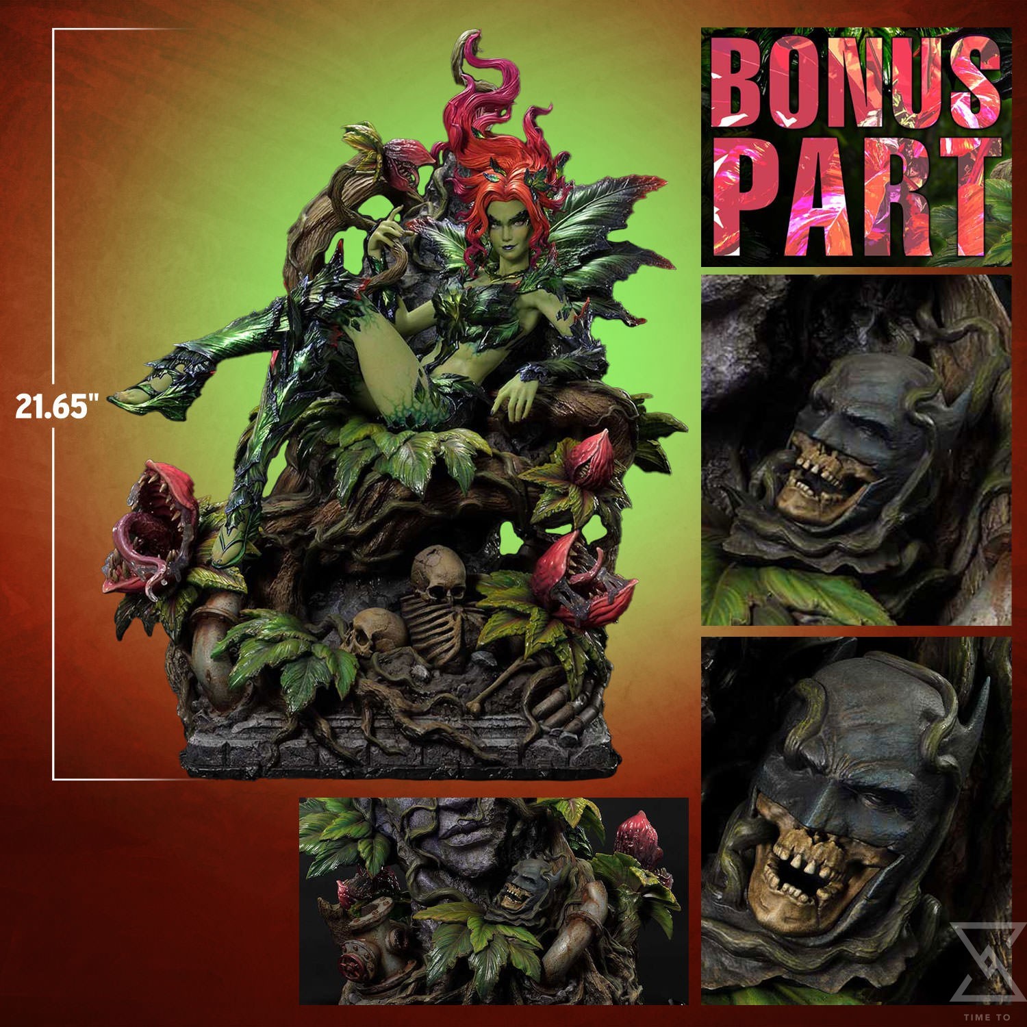 Gazing upon her subjects with the captivating aroma, Poison Ivy is poised majestically upon a throne of lush foliage and twisted vines, roots running deep. The intoxicating fragrance emanates from the overgrown verdant vegetation, hints of exotic flowers, lush greenery, and a touch of danger, said to draw any men under her enchanting spell. The artisans at Prime 1 Studio, once again, with the help of Carlos D’Anda, have crafted this mesmerizing piece that truly captures her allure and power, with every vine and leaf meticulously detailed to perfection. It stands as a testament to the craftsmanship and dedication of true collectors. From her beautiful facial features to the carnivorous plant life in the decayed remnants of their unfortunate victims, from the blossoming culmination of thematic elements on its front to the intricately etched stone and composted casualties on its back, this Poison Ivy collectible statue is a sight to behold from all angles. All hail Queen Ivy!