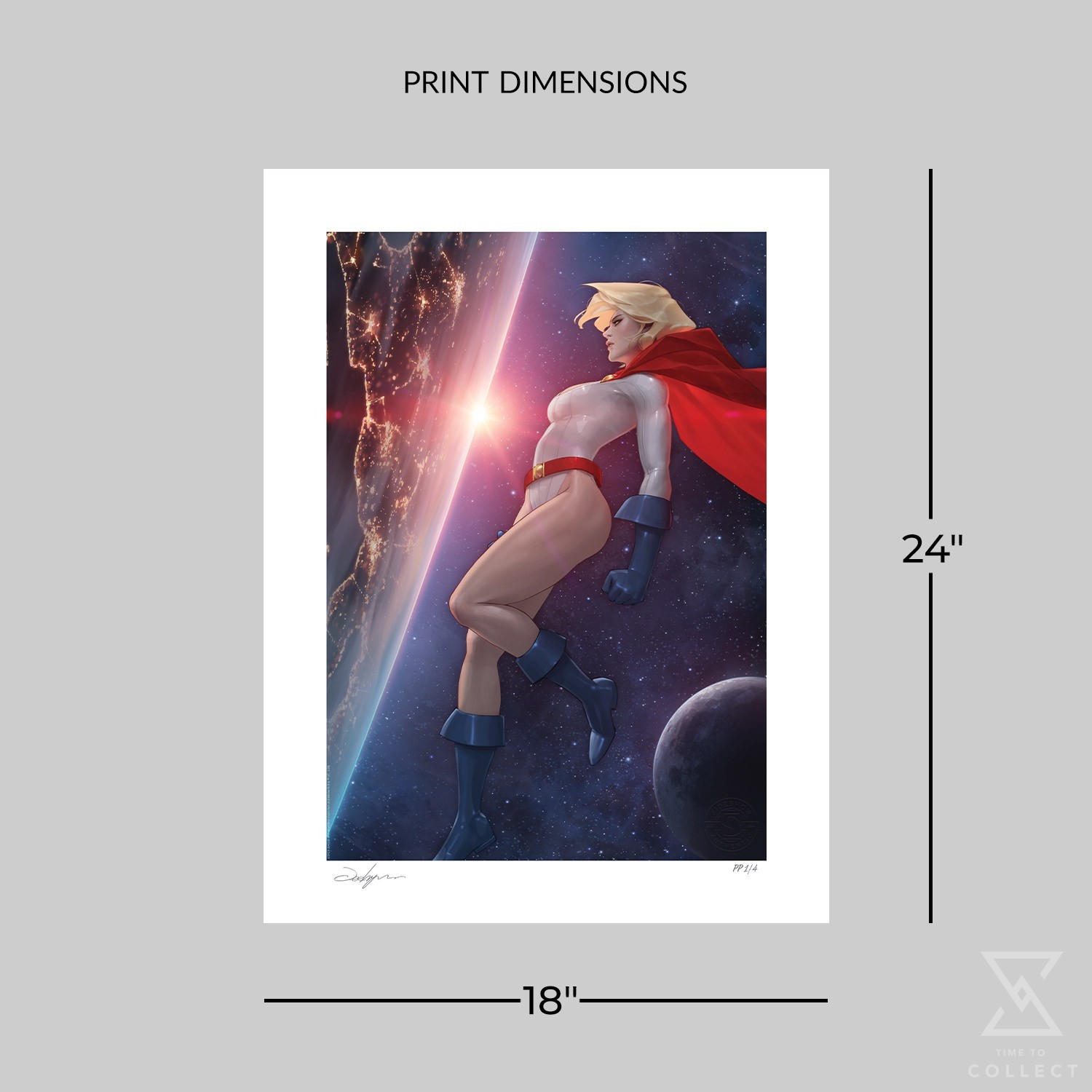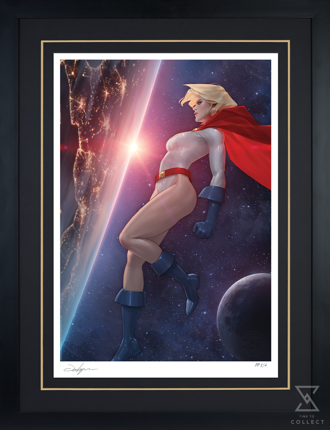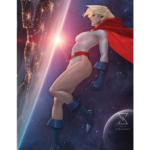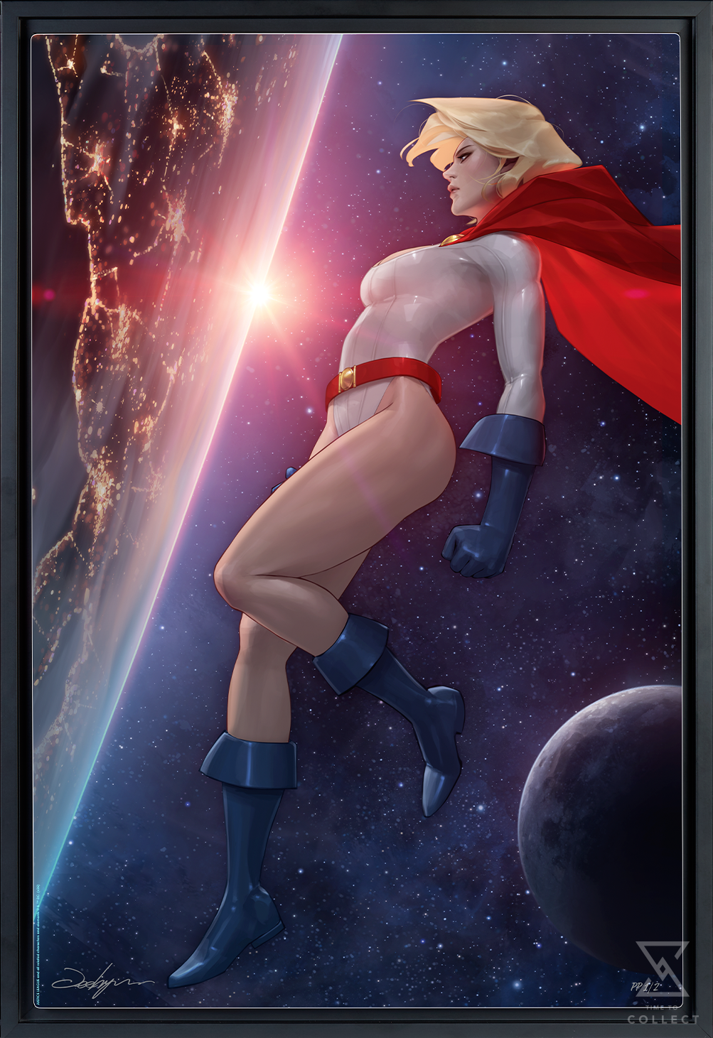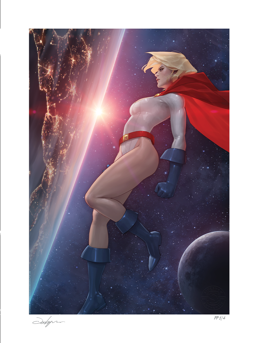 Justice begins and ends with her. Paige Stetler, also known as Karen Starr and Kara Zor-L, finds a moment of calm in this interstellar illustration. A committed protector of Earth, Power Girl surveys the planet from a star’s eye view. As the yellow sun appears over the horizon, the world awakens, bringing this Kryptonian champion renewed strength and purpose.