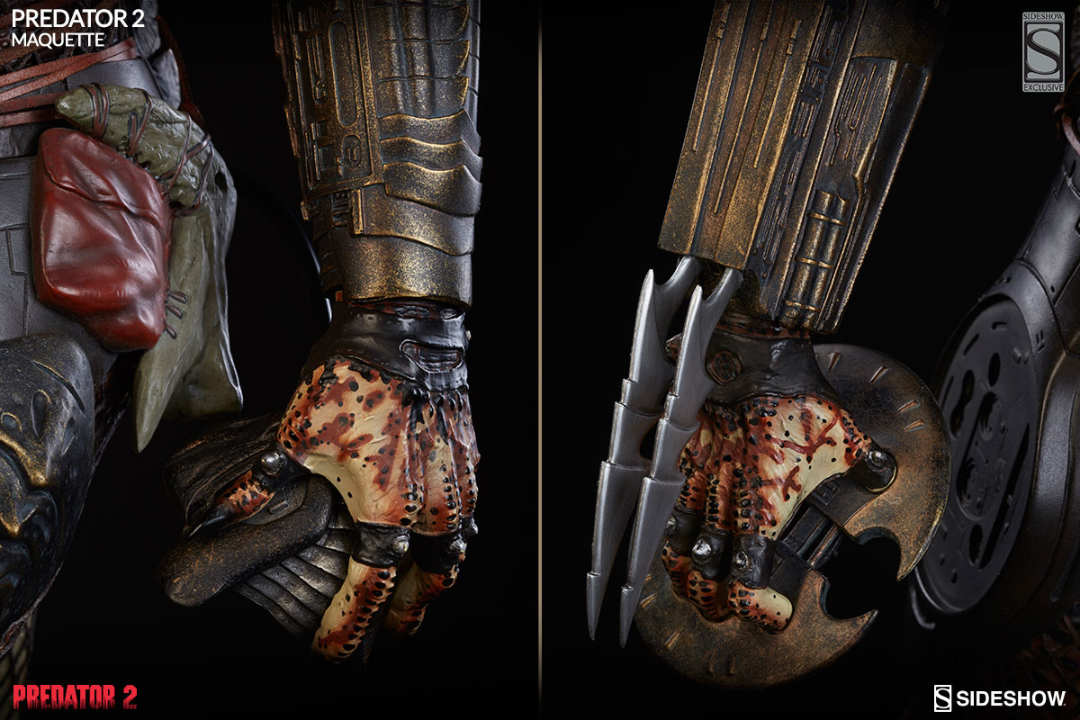Standing over 28 inches tall, in roughly 1:4 scale, the Predator 2 maquette captures every aspect of the cinema icon in a truly unique and customizable display, featuring interchangeable masked and unmasked portraits, and a swap out accessory hand with combi-stick spear.