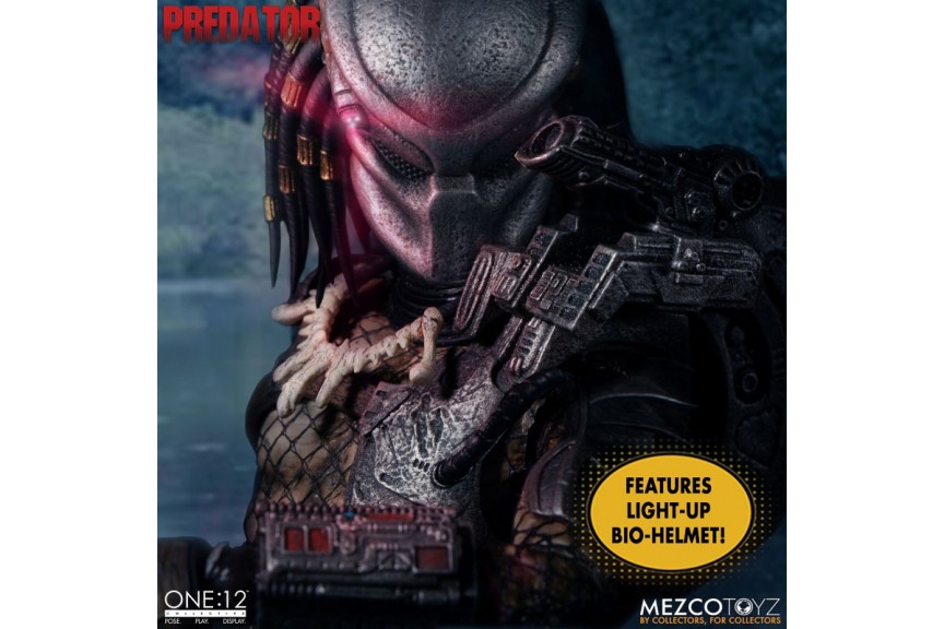 The One:12 Collective Predator is outfitted in battle armor with thermal netting and a fortified chest plate, allowing for greater mobility while hunting. The ruthless hunter comes with 2 removable bandoliers made from the bones of his prey and features a head portrait with an interchangeable mouthpiece and light-up bio-helmet – all attached via a magnet.