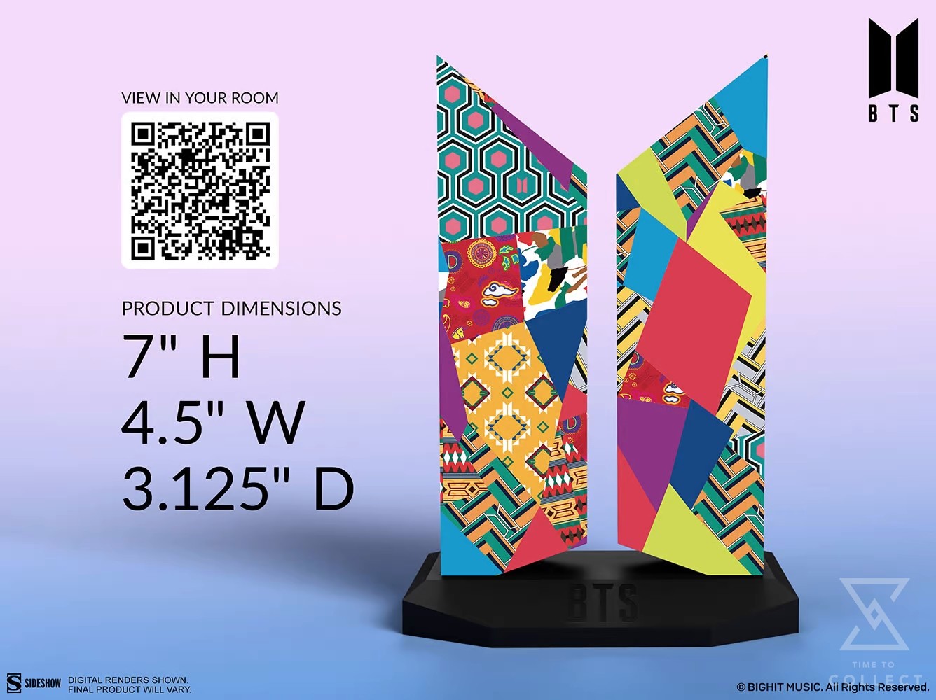 Measuring 7” tall and 4.5” wide, the Premium BTS Logo: IDOL Edition takes the iconic shape of the 21st-century pop icons’ logo, visualized as a set of doors opening outward to possibility, and incorporates vivid, energetic imagery inspired by the “IDOL” theme graphics.
