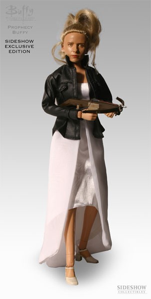 The “Prophecy Girl” Buffy figure features over 30 points of articulation, for full range of motion. Buffy is ready for her second round with the Master, although looking a little beaten and bedraggled after round one, with a fresh bite mark on her neck and scratches on her chest, and a dress looking slightly the worse for wear. Buffy is equipped with her cross necklace, stake, crossbow, and Vampyre book, and a 12 inch ‘Buffy the Vampire Slayer’ figure stand.