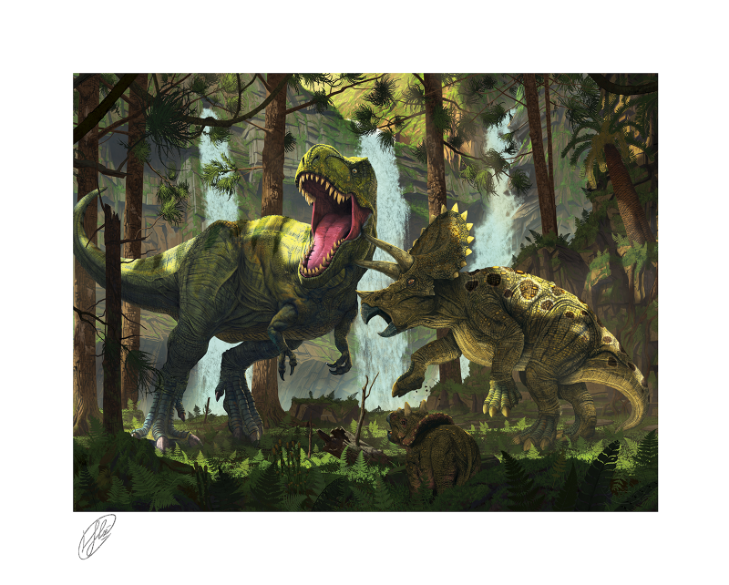 Each Protection Fine Art Print features an authorized, automated artist signature and an embossed Seal of Authenticity as a part of the limited edition of only 150 pieces. This fine art collectible is a must-have for dinosaur enthusiasts. Don’t miss two other additions to this awe-inspiring artist series, including the Curious Fine Art Print and Eruption Fine Art Print, each sold separately.
