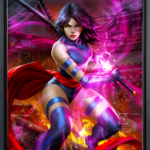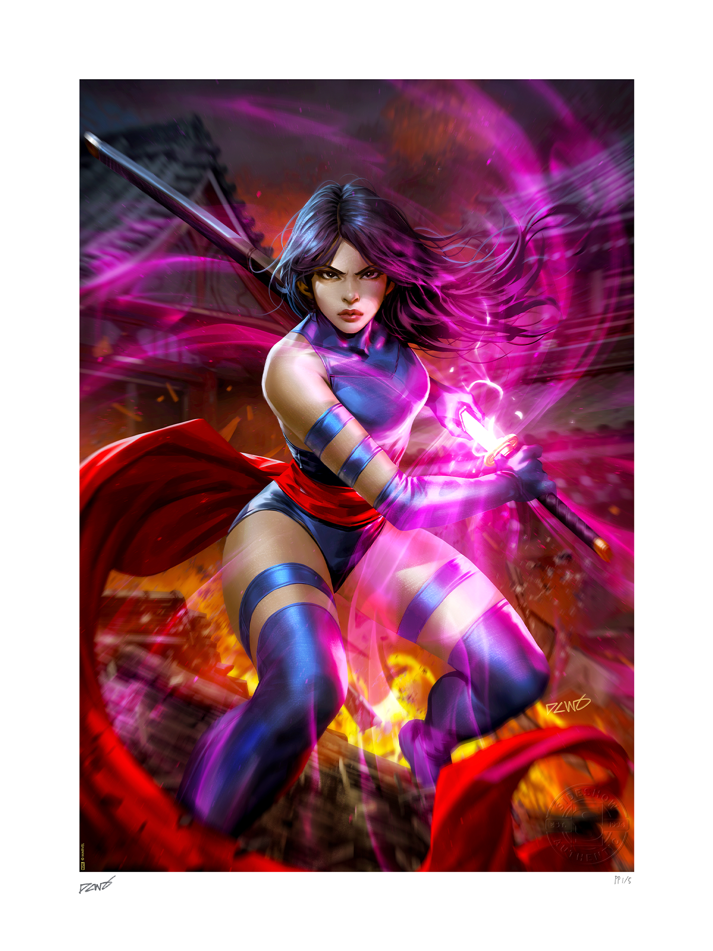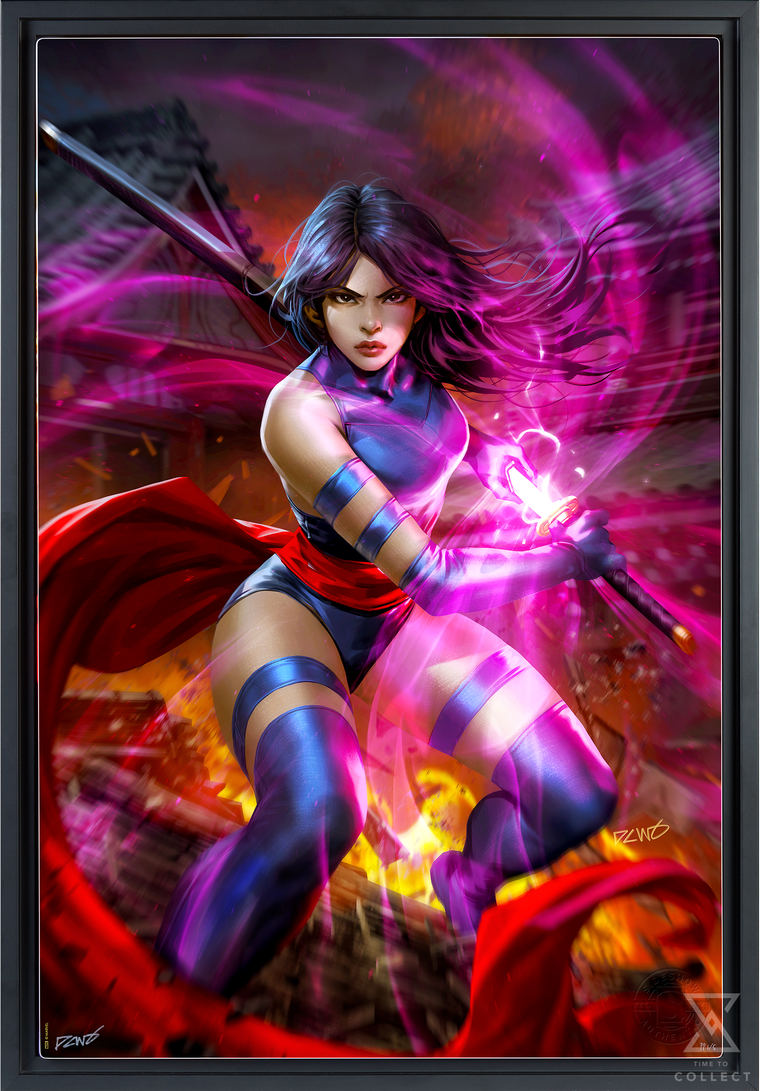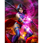 In the midst of battle, Psylocke draws her sword while poised atop a burning pagoda. Flames roar and purple psionic energy radiates around the vengeful Betsy Braddock as she challenges her next opponent. She wears her classic ‘90s costume and a determined expression, each detail illuminated by the bright butterfly shape emanating from her weapon.