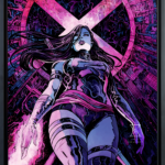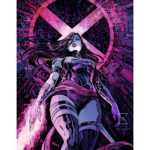 The strength of Psylocke’s psionic abilities shines here in this colorful composition that blends technology and telepathy in Riccardi’s signature kinetic line art style. Betsy Braddock wields a psionic blade in her hand while her katanas are sheathed at her back. Her vibrant pink powers give a dramatic glow to the scene, and a large X symbol haloes her, evoking her mutant identity and the iconic butterfly shape of her psychic abilities in action.