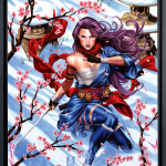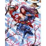 Inspired by Peach Momoko’s imaginative take on Marvel Comics and Japanese folklore, artist Mark Brooks has turned his talents to the iconic X-Men member Psylocke. As the wandering swordswoman Sai, she wields her psychic blade against all manner of mythic threats like demonic oni, ghostly yokai, and even other warriors with familiar faces from the Marvel universe. She stands ready for battle in this beautiful portrait, framed by a snowy forest and cheerful pink blossoms that evoke her own butterfly-shaped powers.