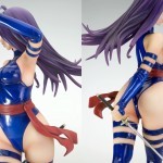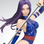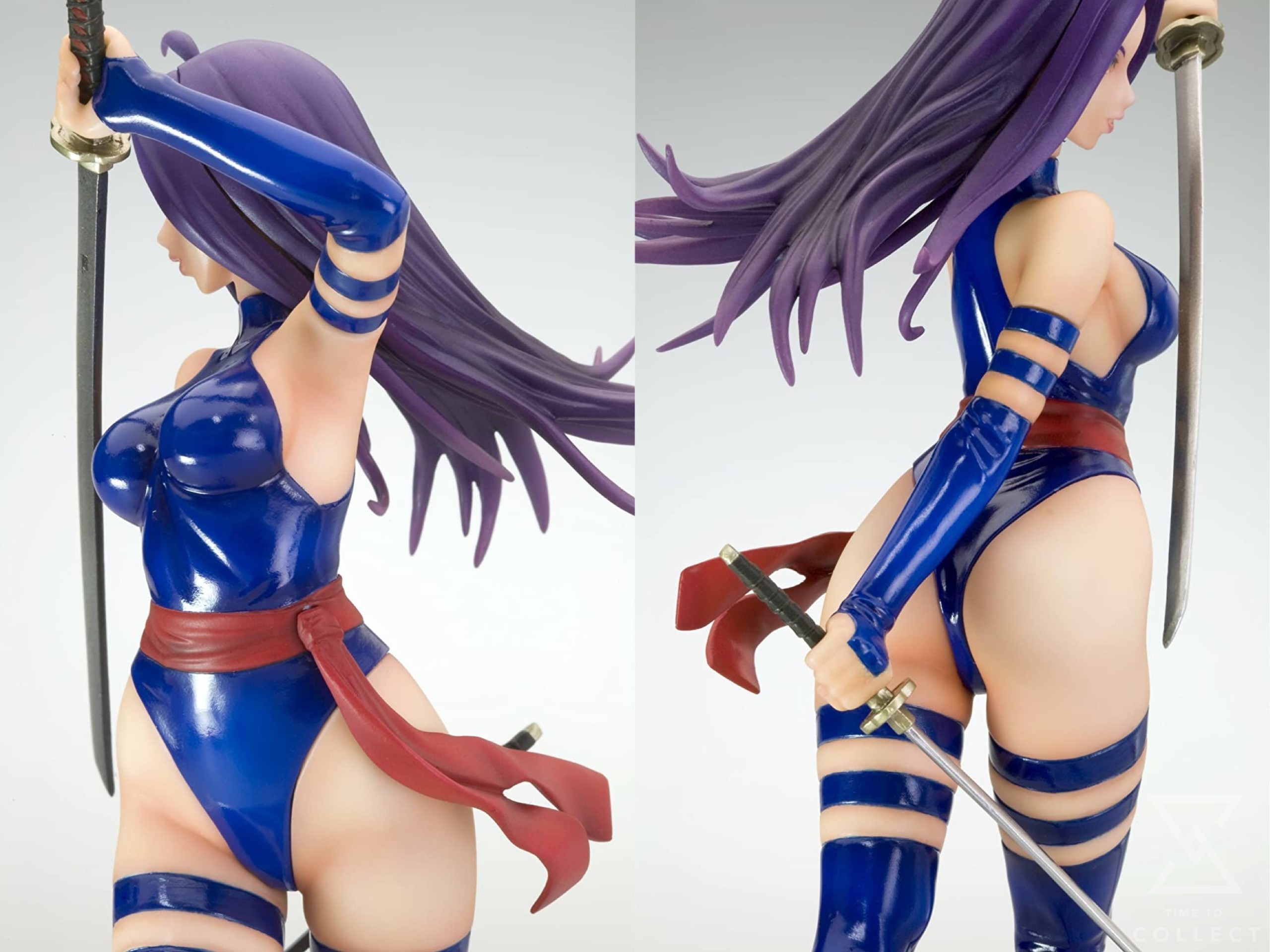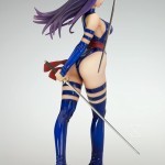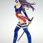 Psylocke is a warrior woman to the core, striking a deadly pose with twin Japanese swords at the ready. The alluring curves of her body are accentuated by her skimpy, skin-tight costume that leaves little to the imagination and the high heeled boots that draw attention to her shapely legs. As Psylocke twists to face her foes her long hair fans out behind her, surrounding her beautiful Bishoujo-styled facial sculpt. The sexy mutant’s bright blue costume and purple hair nicely offset her pale skin.