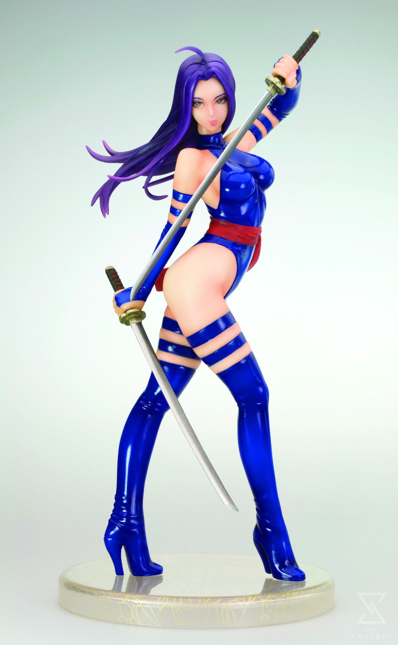 Standing approximately 9 inches tall (in 1/8 scale with the other Marvel Bishoujo statues), Psylocke was sculpted by Yu Ishii. Packaged in an attractive window box, along with an exclusive X-Men logo base, the deadly mutant is constructed of high-quality pvc plastic.