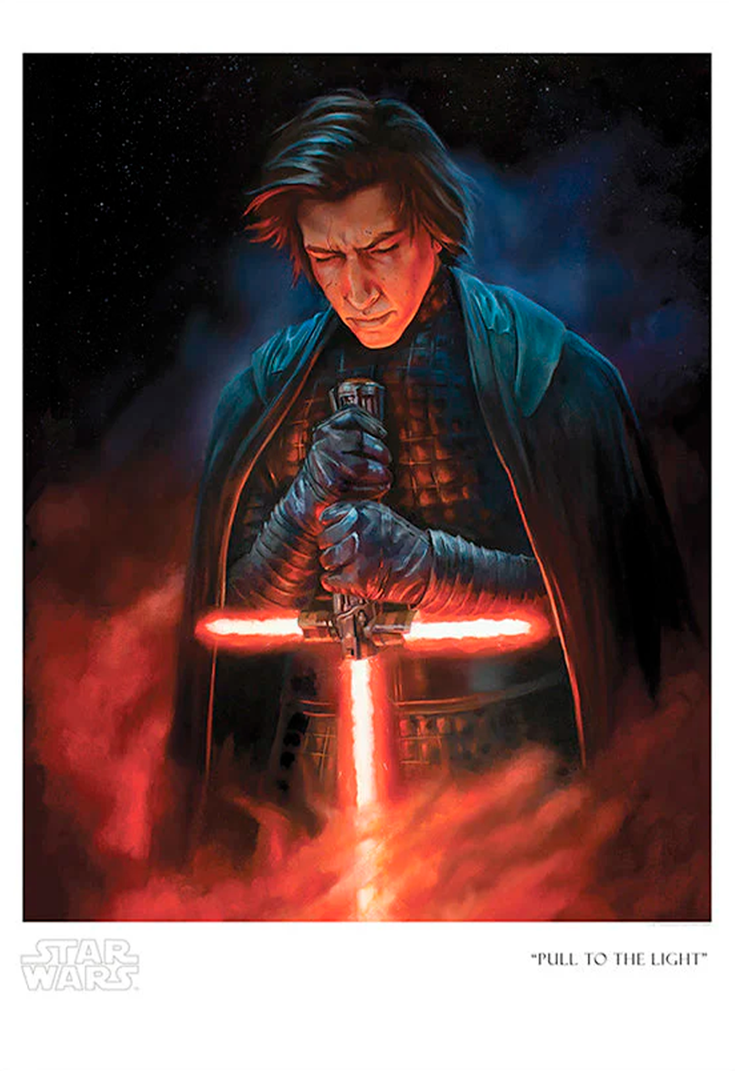 Kylo Ren is burdened by the duality of the Force in this contemplative Star Wars artwork inspired by Star Wars: The Last Jedi. Each fine art giclee print is hand-numbered from a limited edition of 195 pieces and comes with a Certificate of Authenticity.