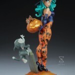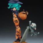 The polystone Pumpkin Witch Statue features a fully sculpted costume inspired by all the glamour and ghoulishness of the Halloween season. Her purple witch hat sits atop seafoam green curls of hair that match her eyes and frame her coy expression. The character also wears a deep blue leotard, matching gloves, and black shoes all with a glossy finish, contrasting her matte orange leggings that are patterned with black cats, bats, and pumpkins in a vintage Halloween style. From the tip of her hat to the buckles on her heels, the Pumpkin Witch exudes a bubbly and vibrant persona that perfectly encapsulates Sanders’ vibrant pin-up style.