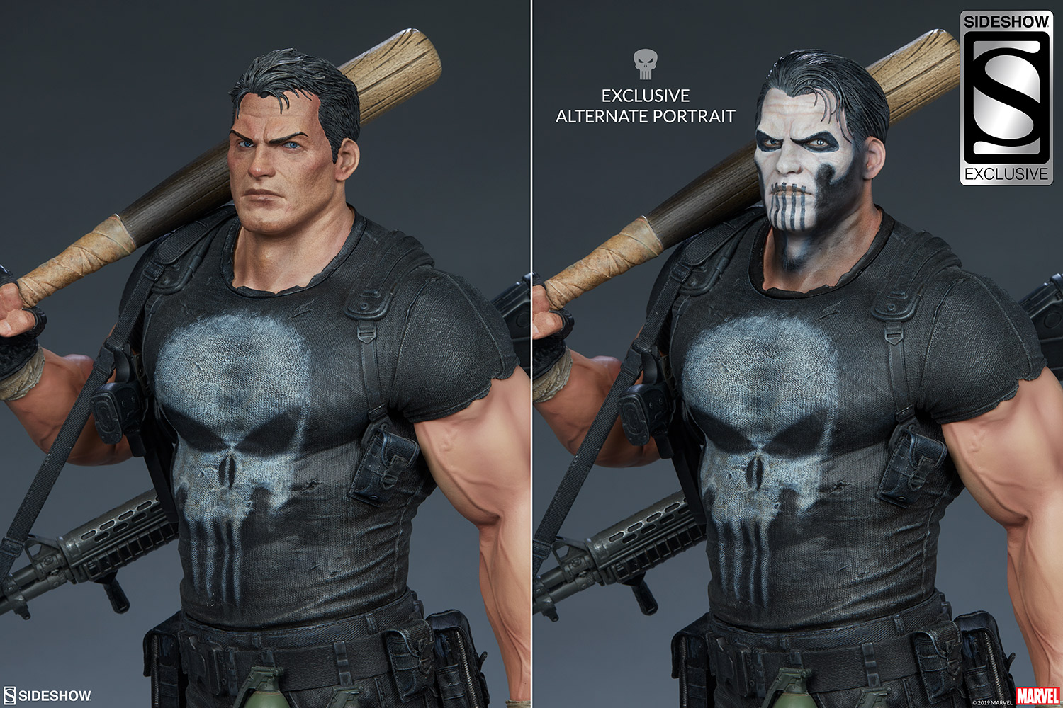 The Exclusive Edition of The Punisher Premium Format™ Figure includes an alternate portrait featuring skull war paint. Camouflage Frank Castle with his iconic death’s head symbol with this exclusive additional display option.