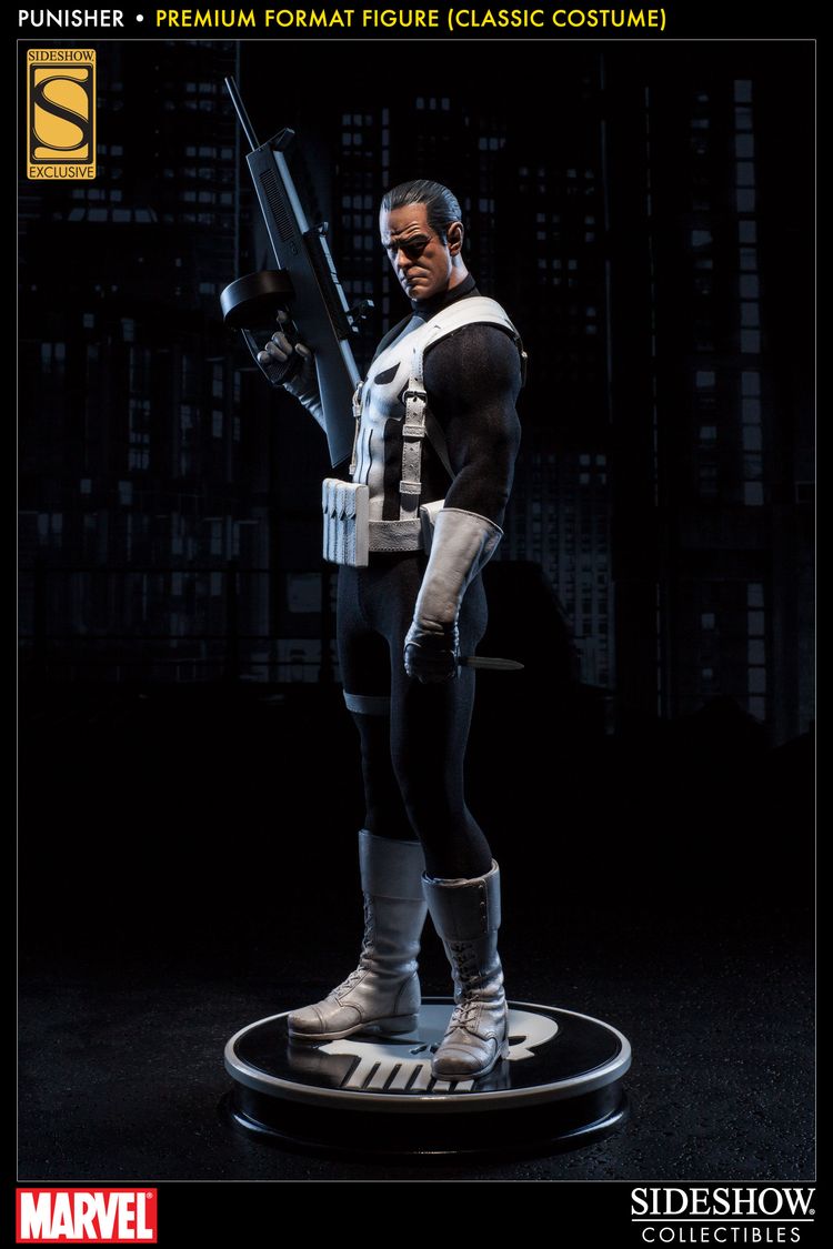 Sideshow Collectibles is proud to present the Punisher Premium Format Figure. Frank Castle comes ready to wage his relentless one-man war on crime, in his traditional classic costume. Marvel Comics’ vigilante ‘anti-hero’ is armed for vengeance with a fully automatic shotgun and holstered pistol. He wears a set of brass knuckles for close quarters combat, and in a bind, there’s a concealed trench blade strapped to his boot. The Punisher Premium Format figure is an outstanding addition to any Marvel collection.
