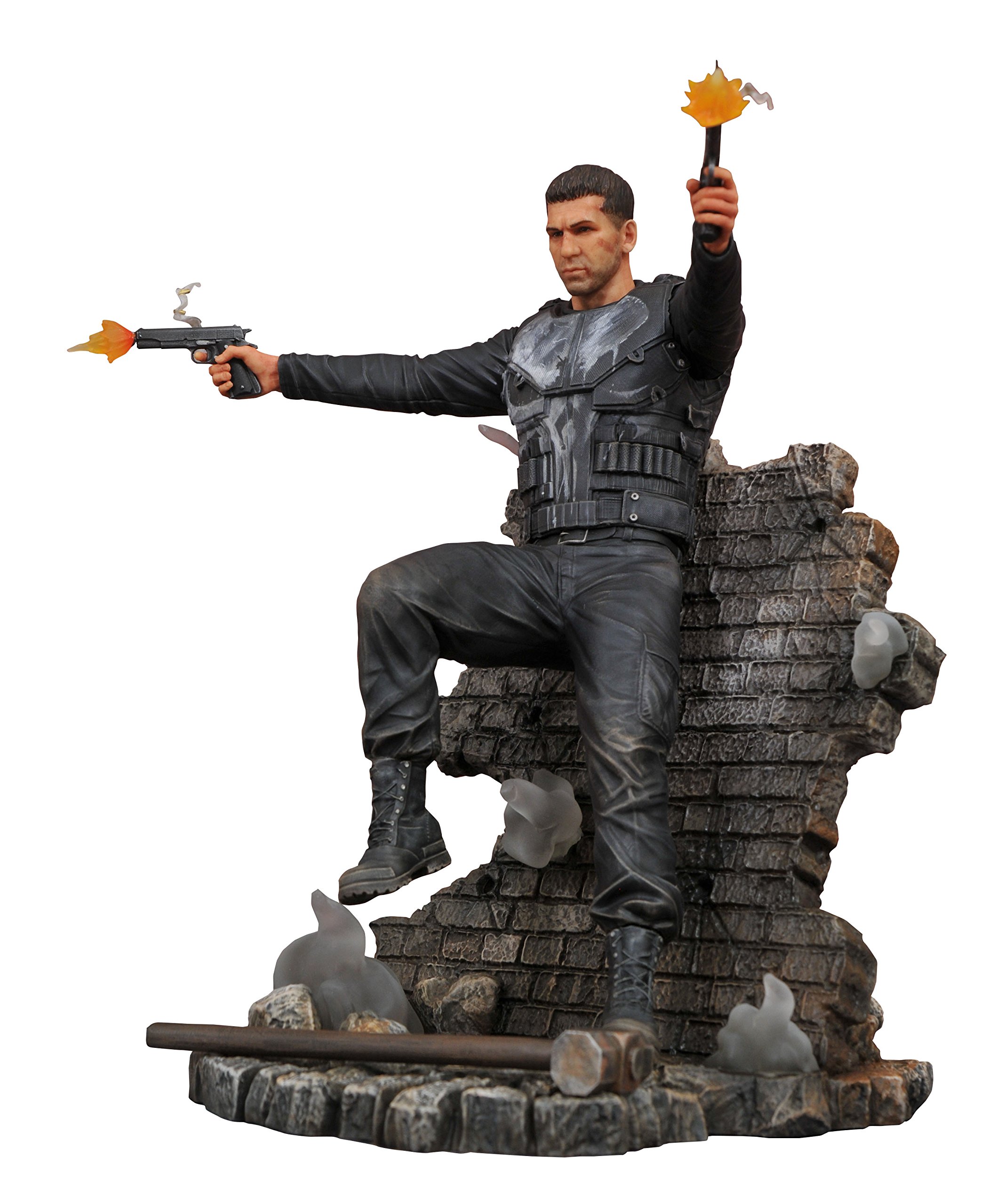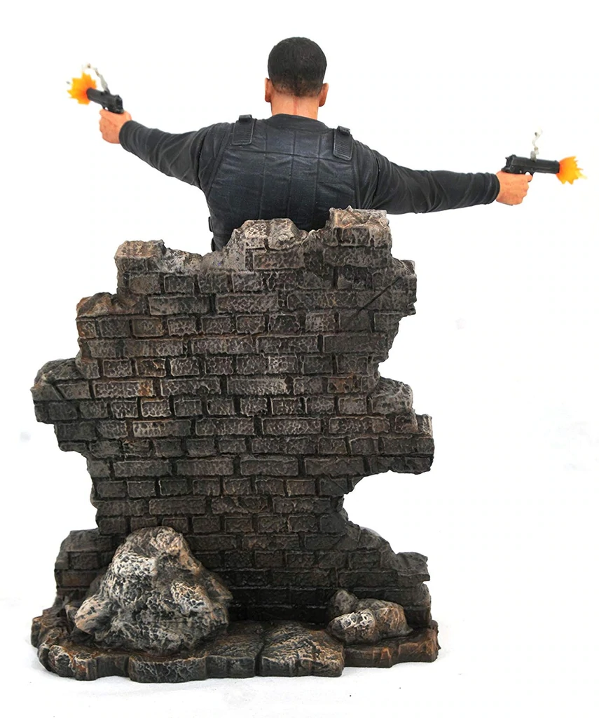 A Diamond Select Toys release! Frank Castle is caught in the crossfire in this all-new PVC diorama from the Marvel Gallery line! Inspired by the new Punisher TV Series on Netflix, this 9-inch PVC diorama shows Frank Castle crashing backwards through a brick wall as he takes aim at multiple targets. This sculpture features the likeness of actor Jon Bernthal, as well as detailed sculpting and paint applications, and comes packaged in a full-color window box. Sculpted by Rocco Tartamella!