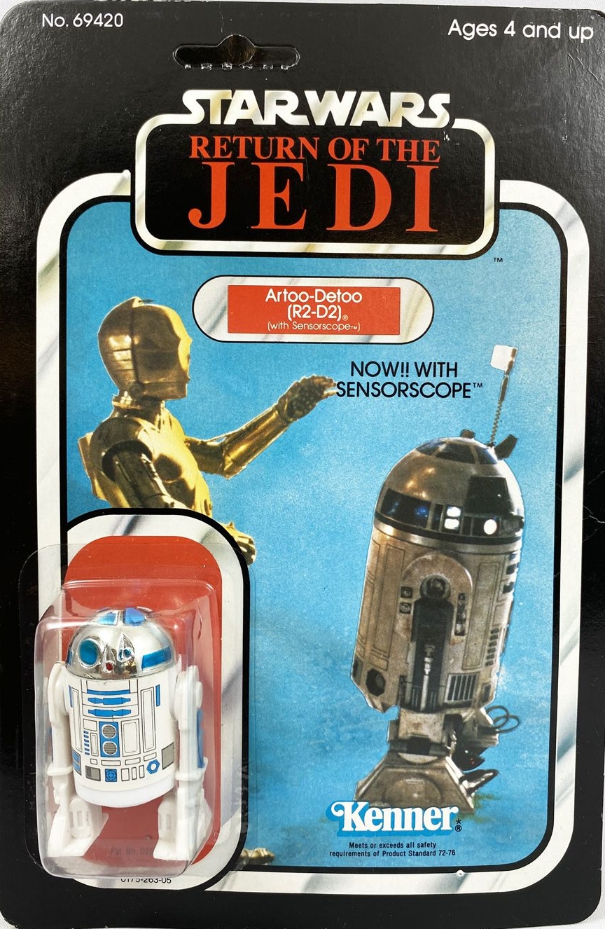 R2-D2 (Sensorscope) released in 1980 as part of the Wave 4 figures by Kenner to support the release of The Empire Strikes Back on the 45 Back card.