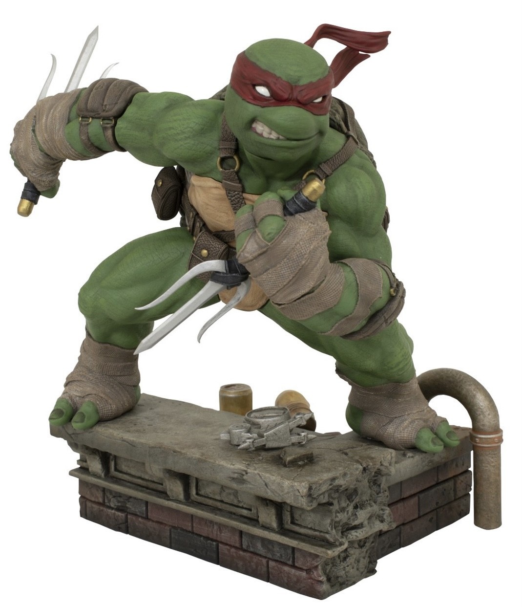 A Diamond Select Toys release! We’re getting the gang back together! Joining Leonardo in our new line of TMNT Gallery Dioramas, Raphael takes his place in the connecting rooftop display! This all-new sculpture stands approximately 9 inches tall, and depicts the hot-headed ninja turtle wielding his twin sais. Made of high-quality PVC it comes packaged in a full-color window box. Designed by Kinetic Underground, sculpted by Sandro Luis Sampaio! Coming soon: Michelangelo and Donatello!