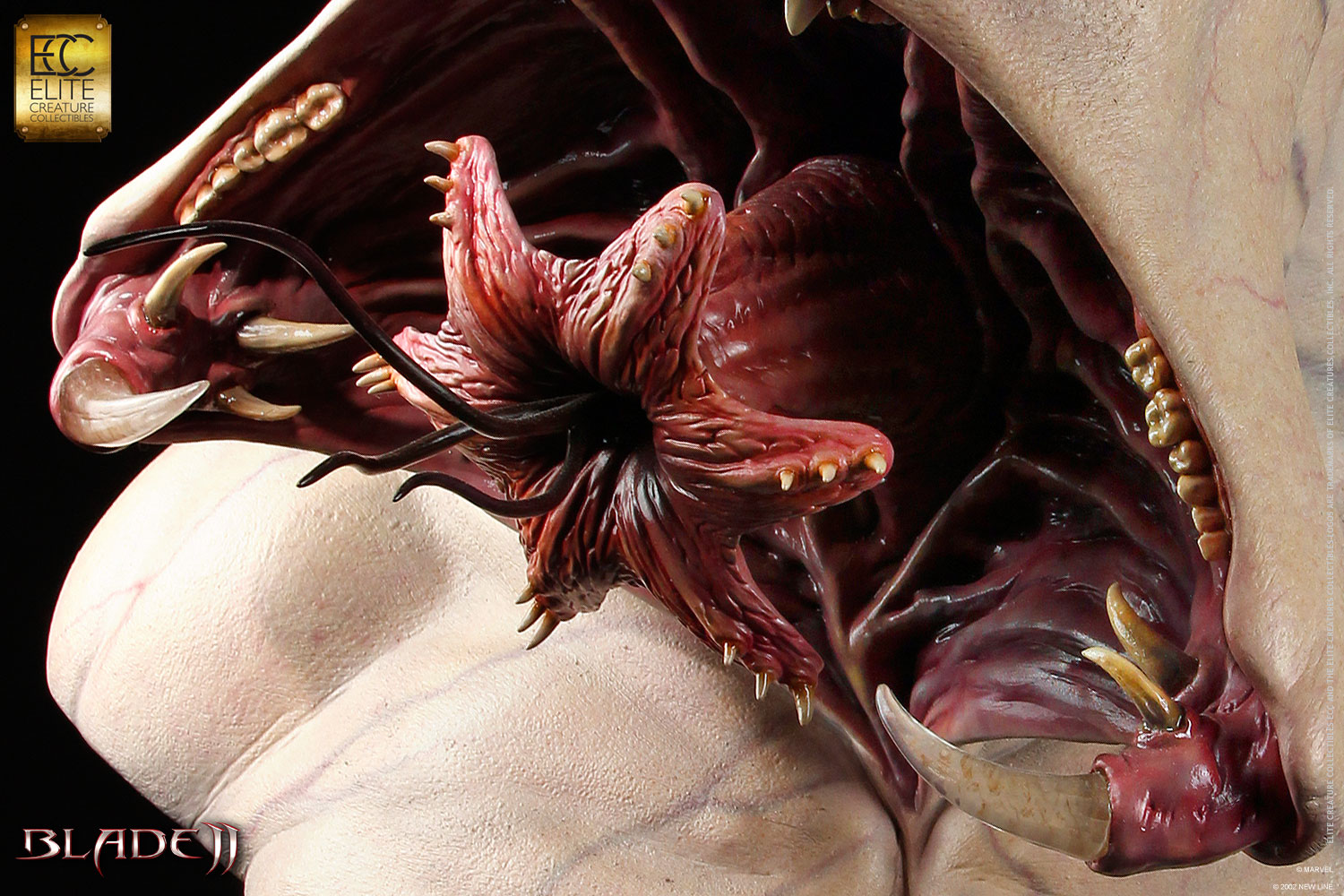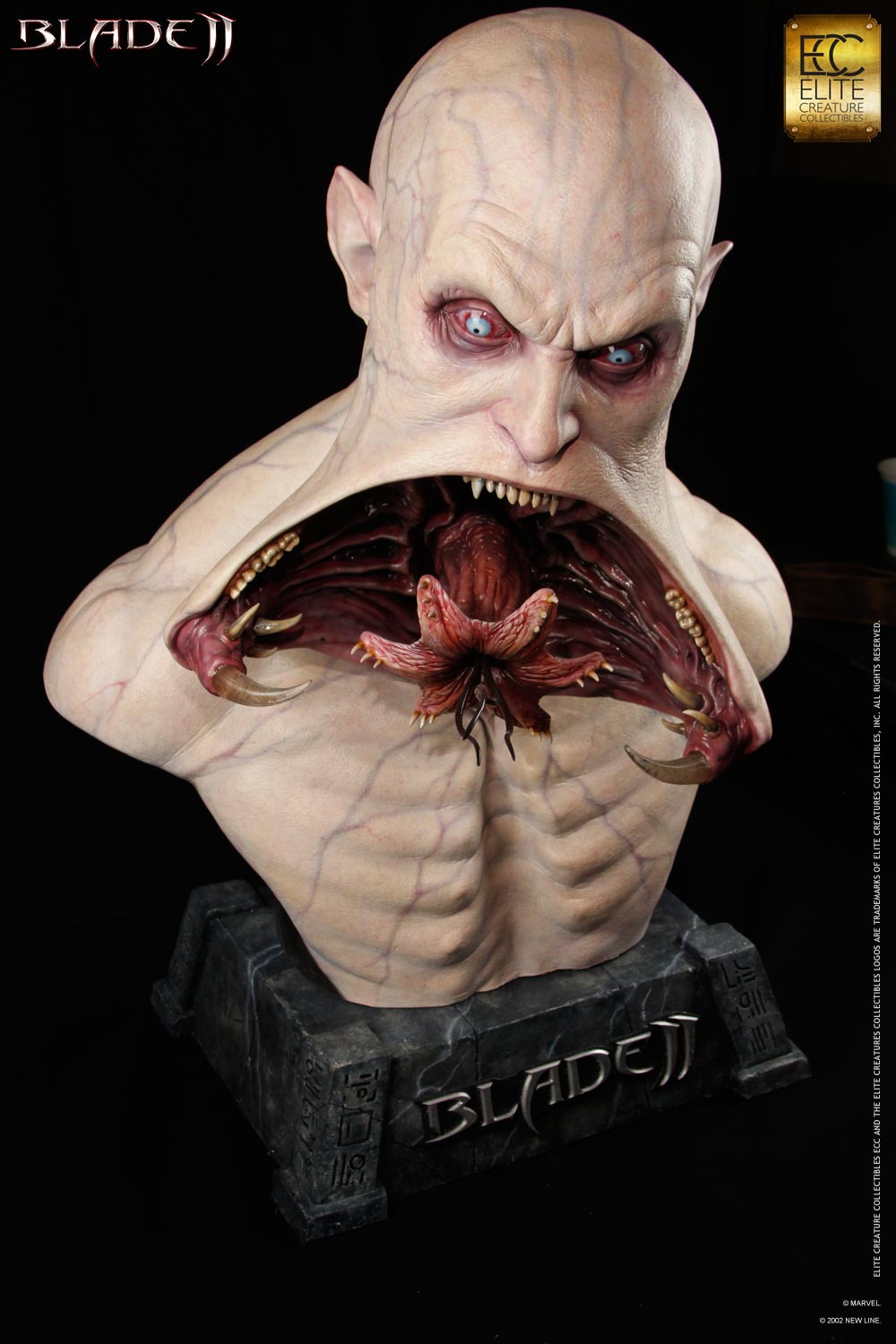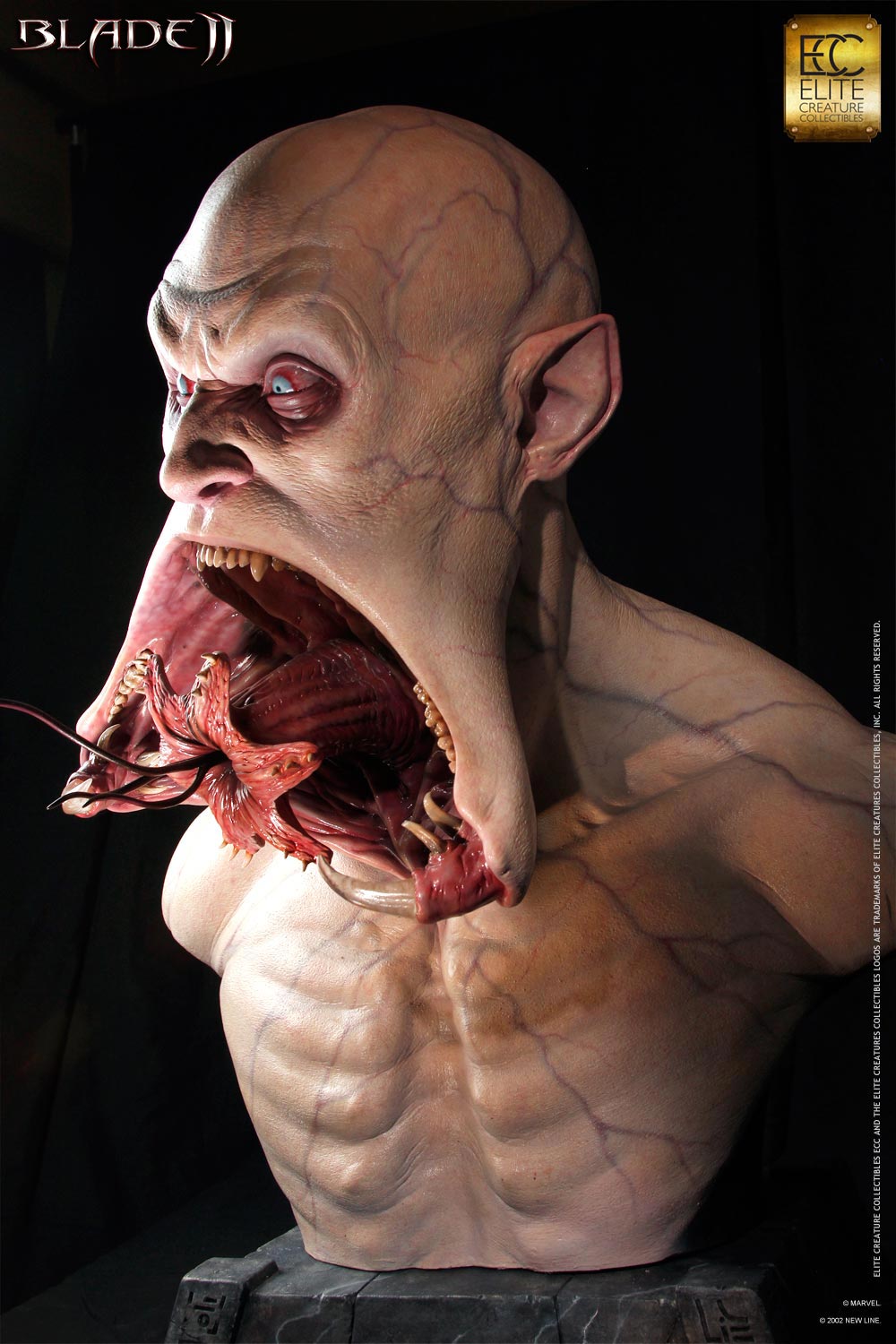 Developed in an effort to create a new race of vampires immune to sunlight and silver, the Reaper strain is realized in terrifying detail in this new life-size Blade 2 bust from Elite Creature Collectibles! The Reaper’s iconic bifurcated jaws are presented fully open, exposing the horrifying nature of the inner mouth, tongue, and barbs. And just like in the movie, the Reaper has overdeveloped masseter muscles, allowing for a much stronger bite! The Reaper bust is set atop a themed base, and is sculpted by Special FX Master Steve Wang.