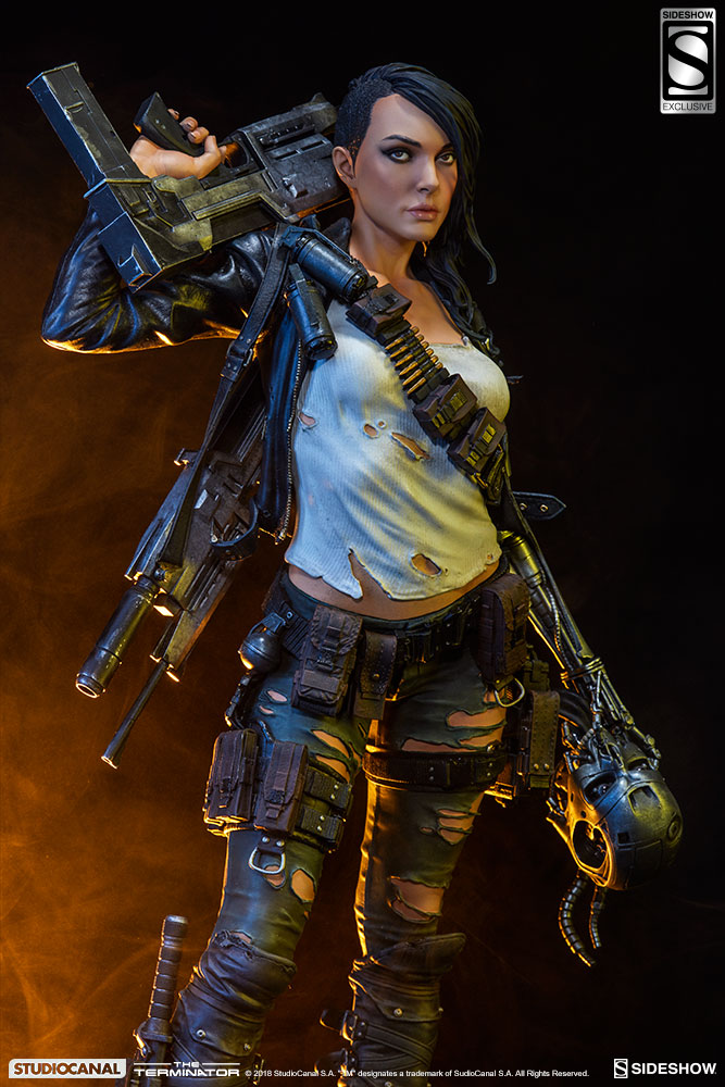 The resin Rebel Terminator – Mythos Premium Format™ Figure features an incredibly detailed sculpted costume, consisting of a black jacket, white undershirt, green pants, and combat boots. Her rugged look is textured with tatters and tears to reflect the raging battle against the oppressive forces of Skynet.